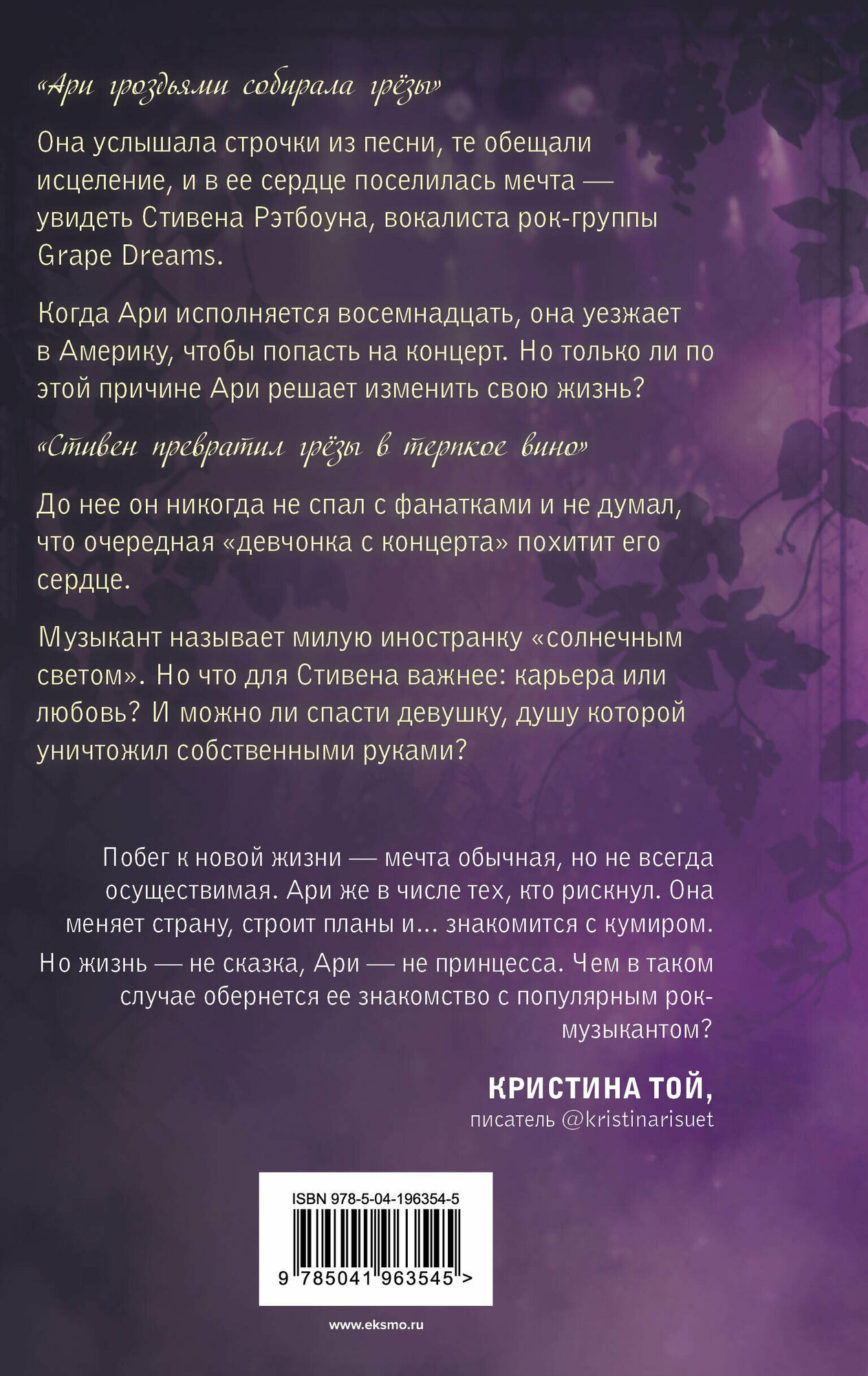 "Ари гроздьями собирала грезы" Она услышала строчки из песни, те обещали исцеление, и в ее сердце поселилась мечта - увидеть Стивена Рэтбоуна, вокалиста рок-группы Grape Dreams. Когда Ари исполняется восемнадцать, она уезжает в Америку, чтобы попасть на концерт. Но только ли по этой причине Ари решает изменить свою жизнь? "Стивен превратил грезы в терпкое вино" До нее он никогда не спал с фанатками и не думал, что очередная "девчонка с концерта" похитит его сердце. Музыкант называет милую иностранку "солнечным светом". Но что для Стивена важнее: карьера или любовь? И можно ли спасти девушку, душу которой уничтожил собственными руками?