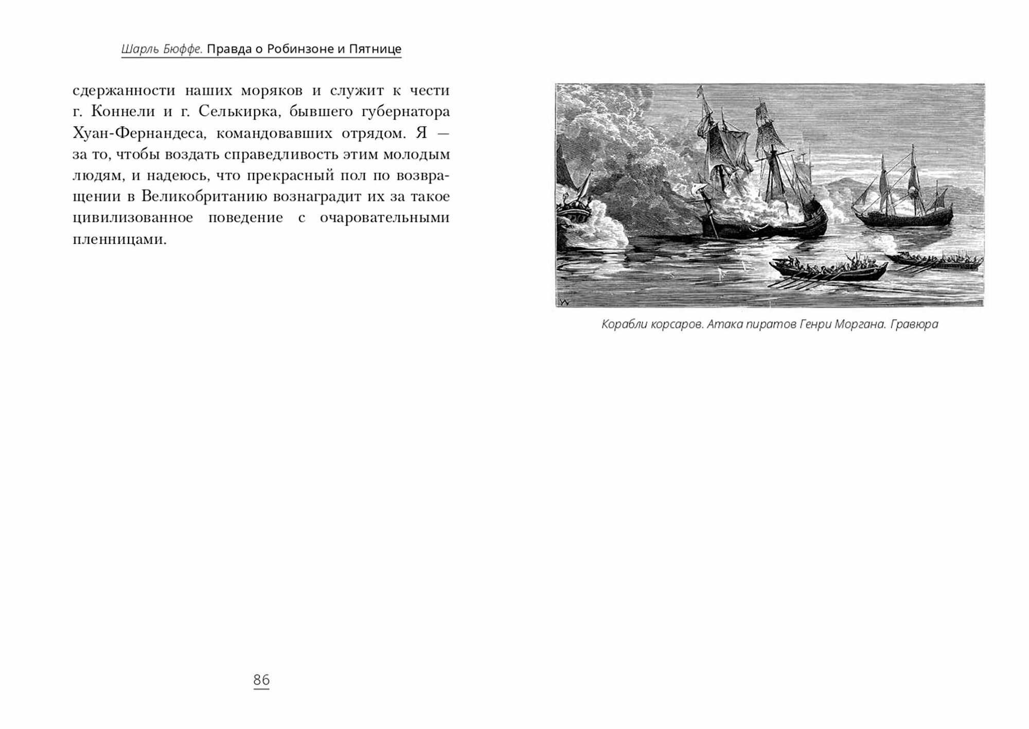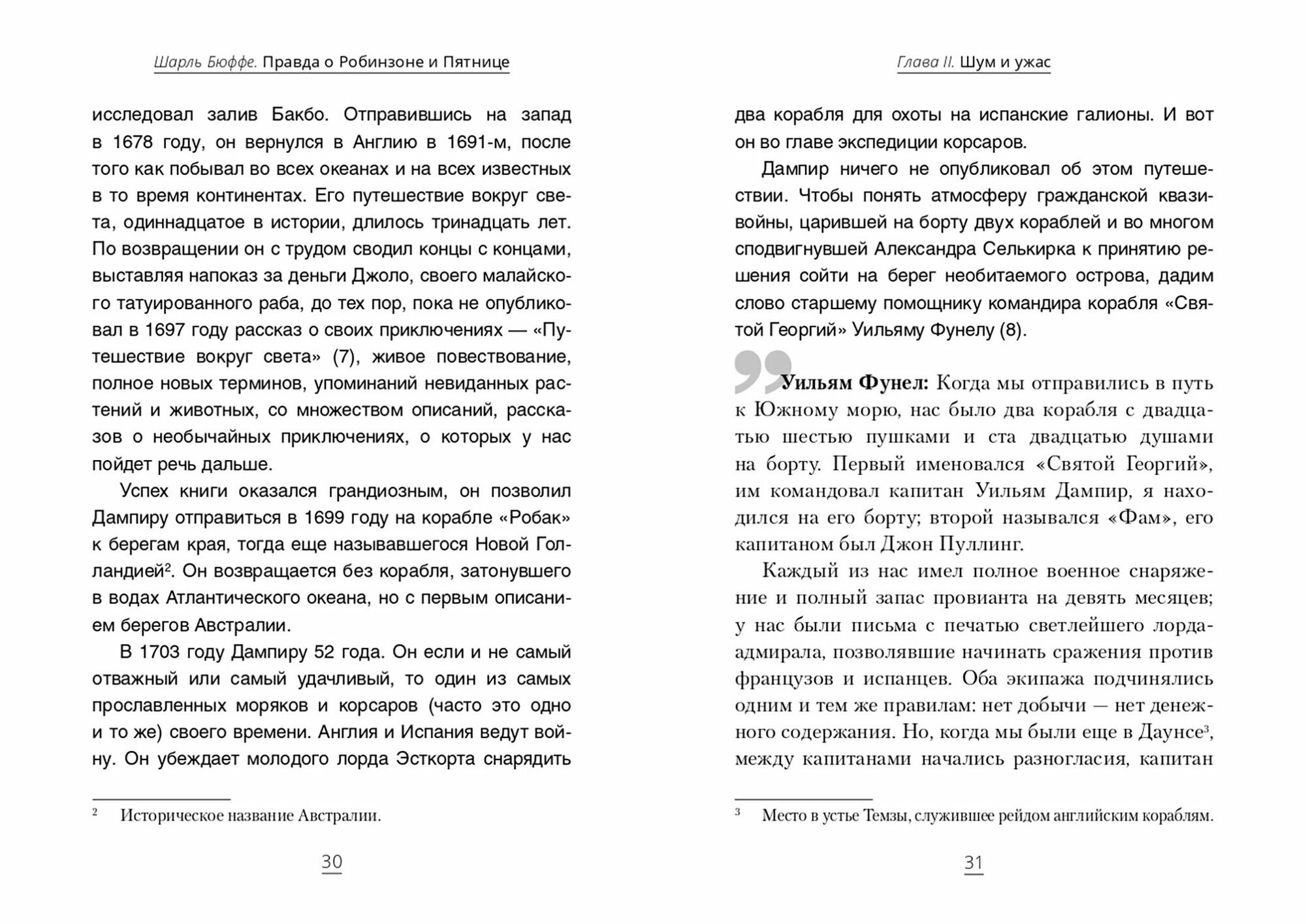 История морских приключений полна не только географическими открытиями, но трагедиями, когда корабли тонули, а экипаж отпевали заочно, ибо их могилой становилось море. Но тем удивительнее оказывалось возвращение «с того света» тех, кто после кораблекрушения чудом смог добраться до необитаемого клочка суши и выжил трудолюбием и надеждой. Вне зависимости от национальности, эпохи и биографии их всех называют одним именем - робинзоны. Многие знают о жизни Робинзона Крузо. Но мало кто знает, что Даниель Дефо описал историю, которая на самом деле реальная. Первого февраля 1709 года корабль английских пиратов бросает якорь вблизи необитаемого острова Хуан-Фернандес, затерянного посреди Тихого океана. Экипаж замечает огонь на берегу. На следующий день часть команды, отправленная к берегу на шлюпке, находит «человека, одетого в козьи шкуры и кажущегося более диким, чем их первые обладательницы». Это Александр Селькирк - шотландский моряк, оставленный на острове четыре года назад, он с трудом припоминает родной язык, чтобы рассказать капитану Вудсу Роджерсу, каким образом ему удалось выжить. Шарль Бюффе, автор книги «Правда о Робинзоне и Пятнице», увлеченный историей «настоящего» Робинзона, нашел и перевел оригинальные рассказы свидетелей того времени: Вудса Роджерса, Уильяма Фунела, Джона Уэльба, Бэзила Рингроза и Уильяма Дампира. Он комментирует их, чтобы лучше понять невероятный опыт моряка Александра Селькирка, ставший на столетия одной из самых мощных и ярких историй благодаря перу Даниеля Дефо.