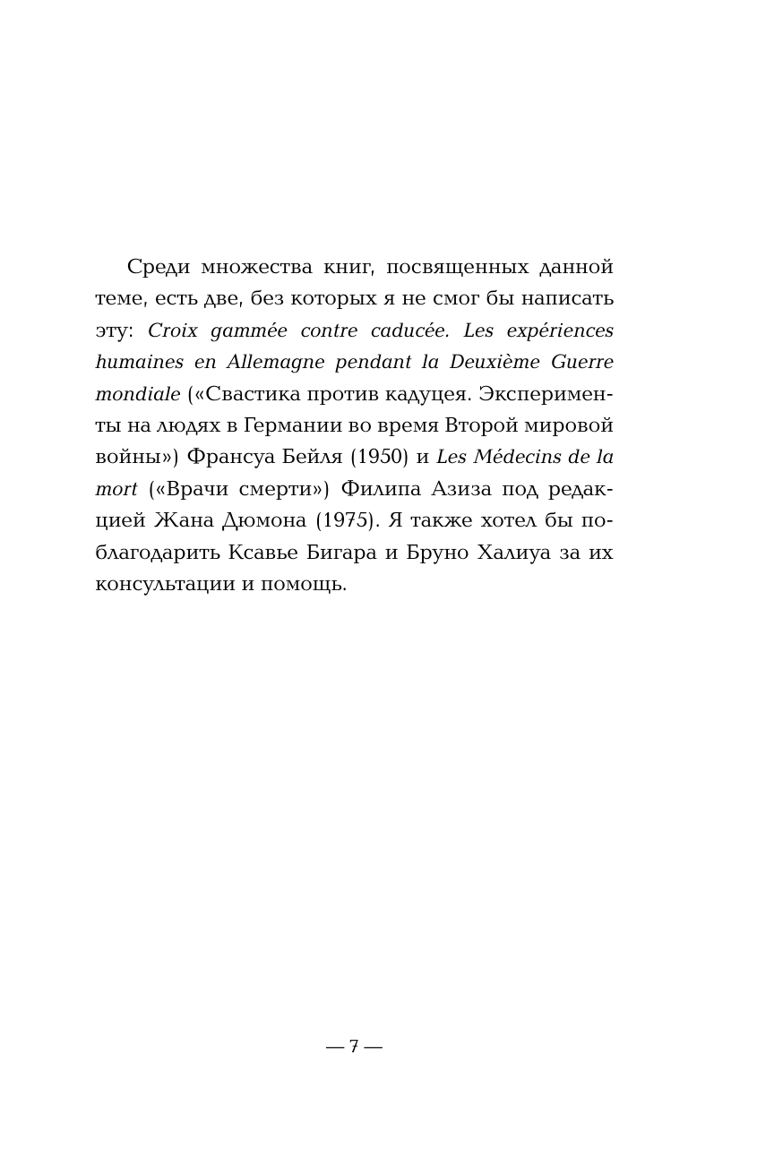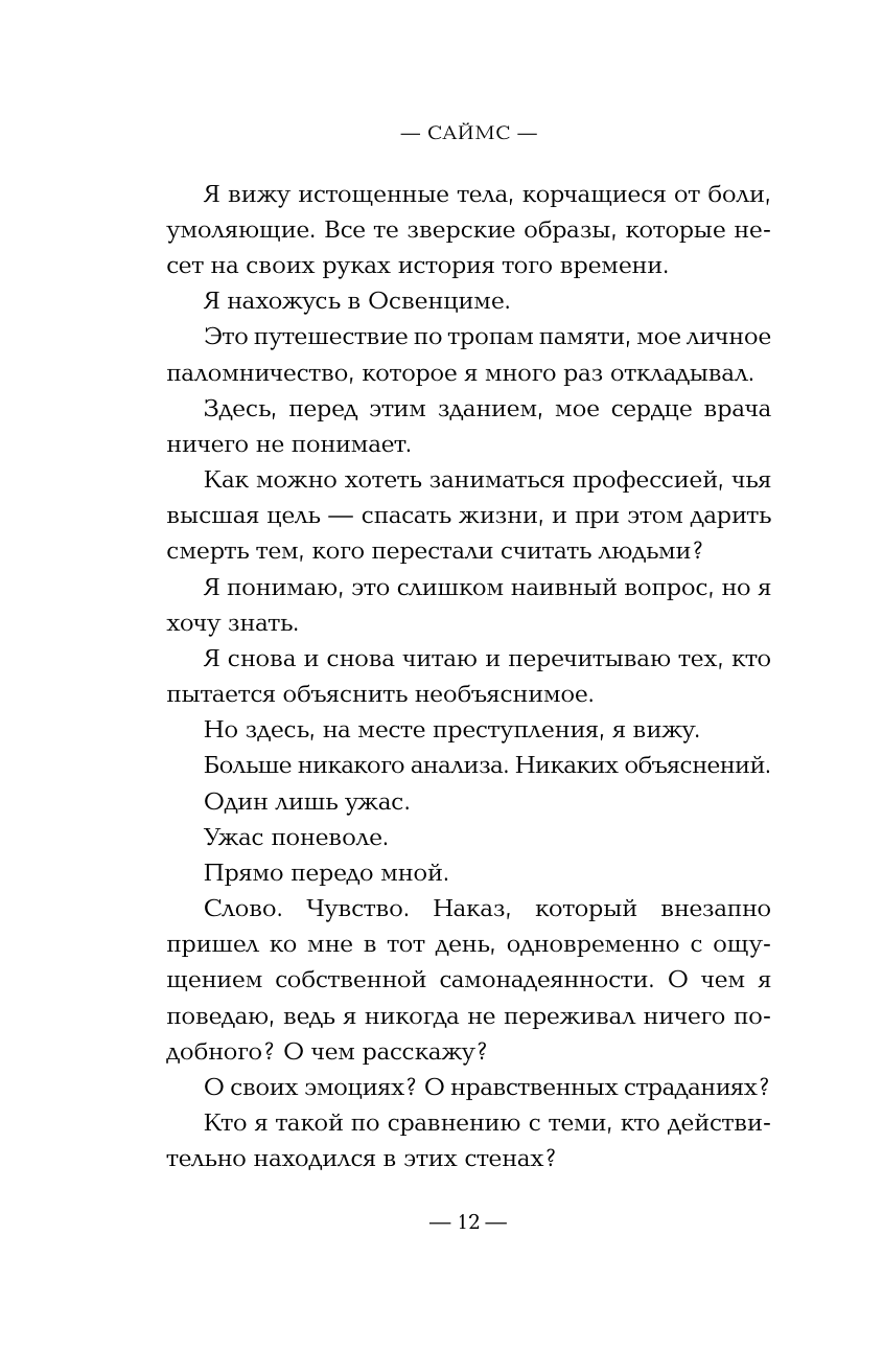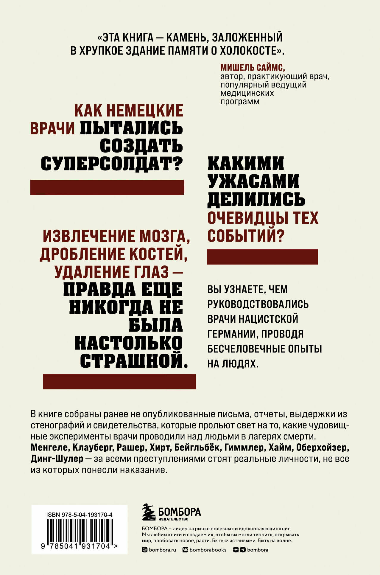 Ужасающие истории о тех, кто проводил эксперименты, заставляющие стынуть в жилах кровь. Мишель Саймс, практикующий врач и популярный ведущий медицинских программ, предоставляет доказательства этих бесчеловечных деяний, поименно называя тех, кто руководил, мучил, уничтожал. Менгеле, Клауберг, Рашер, Хирт, Бейгльбек, Гиммлер, Хайм, Оберхойзер, Динг-Шулер - за всеми преступлениями стоят реальные личности, портреты которых нам мастерски точно рисует автор, показывая, что реальность порой хуже любого ночного кошмара.