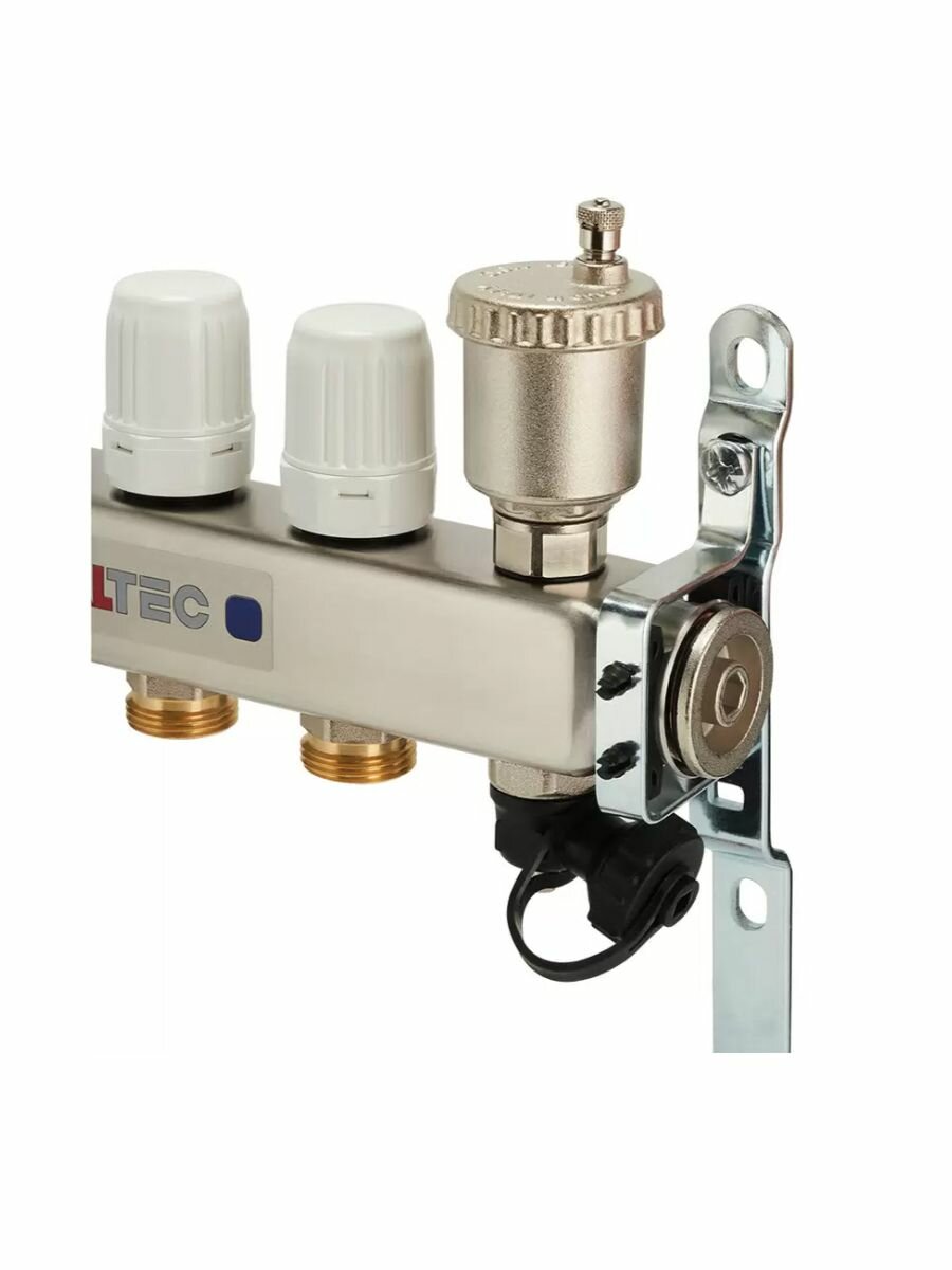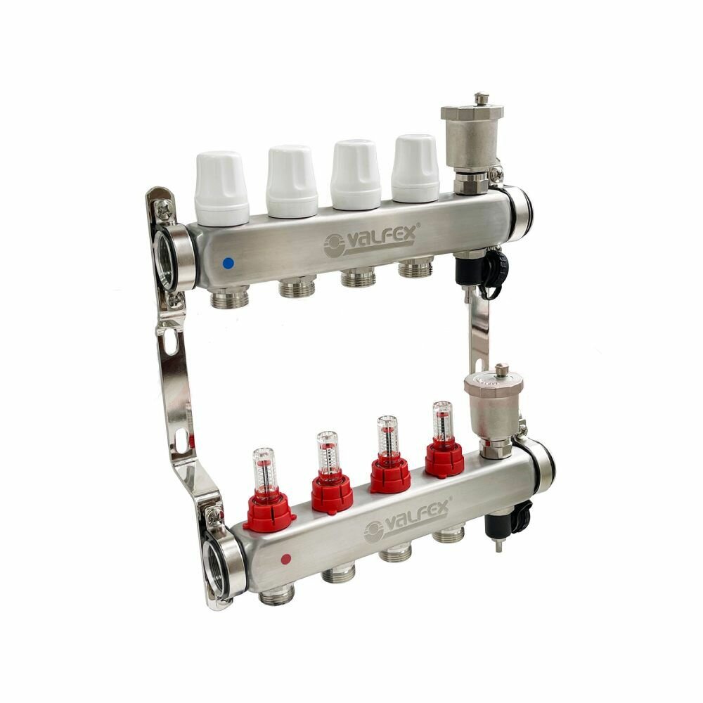 - Коллекторные блоки для распределения теплоносителя по петлям теплого пола или по приборам отопления. Выходы подающего коллектора укомплектованы ручными регулировочными клапанами с расходомерами, обратного – ручными запорными клапанами, на которые можно установить электротермические сервоприводы. Каждый коллектор имеет автоматический воздухоотводчик и дренажный клапан. Материал корпуса – нержавеющая сталь AISI 304, фитинги, детали термоклапана, корпус воздухоотводчика выполнены горячим штампованием из латуни CW617N, уплотнительные кольца, золотниковые прокладки клапанов – из EPDM 70Sh. Количество выходов – от 2 до 12, рабочее давление – 8 бар, рабочая температура – 90 °С. Условный диаметр коллекторов – 1". Резьба выходов – наружная, 3/4". Присоединение циркуляционных петель осуществляется с помощью фитингов стандарта «евроконус».