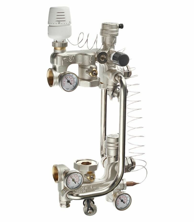 В насосно-смесительном узле VALTEC COMBI для водяных теплых полов приготовление теплоносителя с температурой от 20 до 60 °С происходит за счет подмеса жидкости из обратной линии. Регулирование осуществляется двухходовым клапаном, установленным в подающем коллекторе и управляемым термостатической головкой с выносным погружным датчиком, который размещен на выходе смесительного узла.(При использовании контроллера отопления функция управления клапаном передается ему.) Балансировочный клапан в линии подмеса задает соотношение теплоносителя, поступающего из обратной линии вторичного контура и прямой линии первичного. Другие основные элементы узла