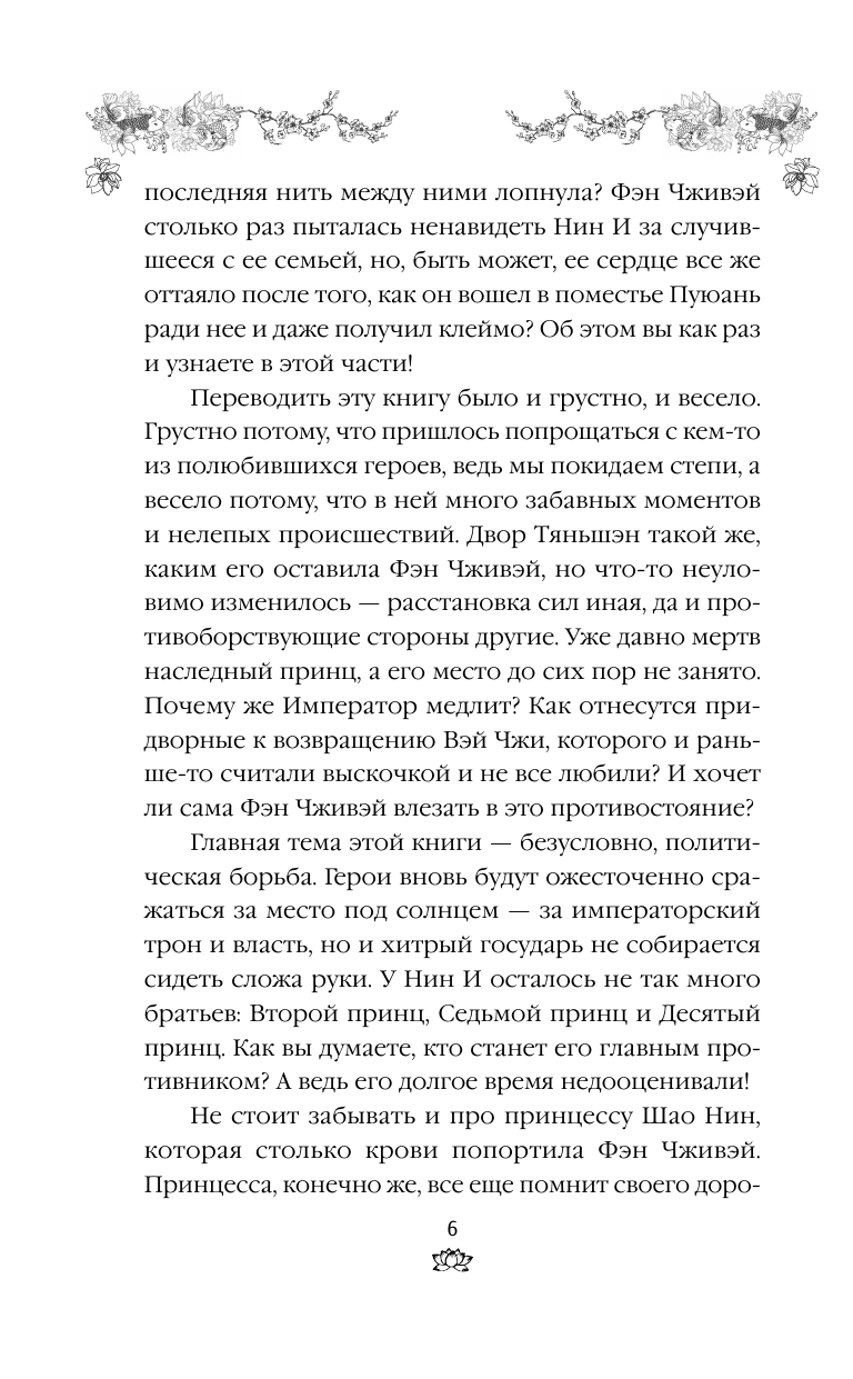 Влюбившись в феникса, дракон будет верен ему до конца Несколько месяцев Цзинь Сыюй удерживал Фэн Чживей в плену. Он подвергал ее испытаниям, но Чживей не сдалась. Она рискнула собственной жизнью во имя долга… и выжила. Но какой ценой? Ее душа оказалась на грани истощения. Горе и ненависть отравили сердце. И все по моей вине. Меня зовут Нин И. Больше не в силах смотреть, как страдает мой самый дорогой человек, я вернул Фэн Чживей в Дицзин. Однако прежде не без помощи секретной техники лекаря Цзуна запечатал ее воспоминания, но не чувства. Я смотрю как Чживей вновь готовится сражаться за Империю, оплетая императорский дворец интригами. Мне все равно, что ждет нас в конце, если она останется со мной…