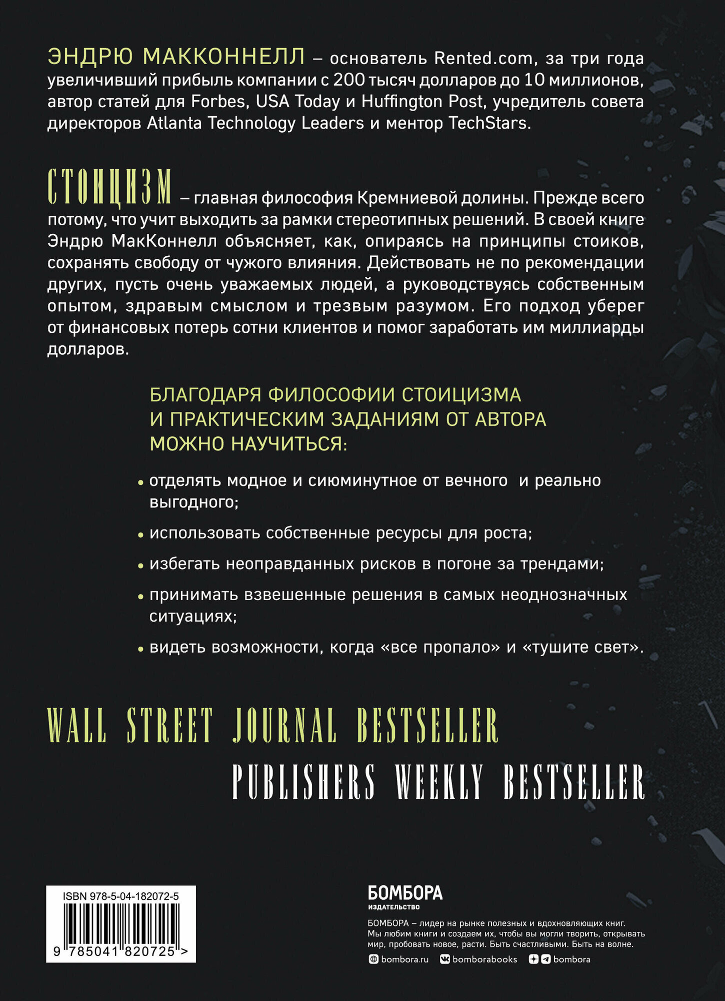 Стоицизм – главная философия Кремниевой долины. Прежде всего потому, что учит выходить за рамки стереотипных решений. В своей книге Эндрю МакКонелл объясняет, как, опираясь на принципы стоиков, сохранять свободу от чужого влияния. Действовать не по рекомендации других, пусть очень уважаемых людей, а руководствуясь собственным опытом, здравым смыслом и трезвым разумом. Его подход уберег от финансовых потерь сотни клиентов и помог заработать им миллиарды долларов.