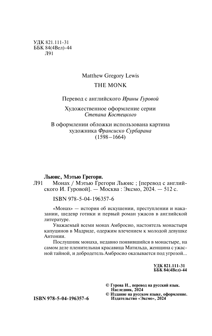 Книга: Монах (Мэтью Грегори Льюис); Эксмо, Редакция 1, 2024