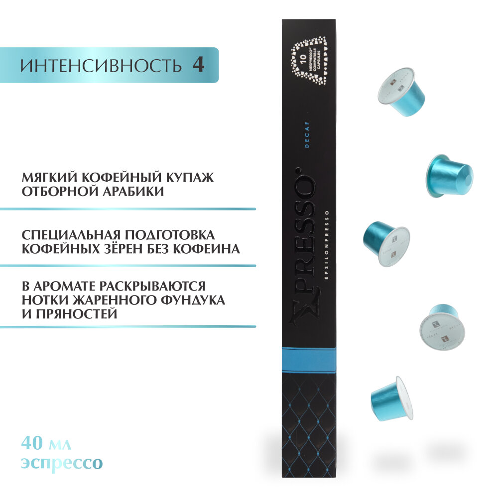 На сегодняшний день товар «Кофе в капсулах EPSILONPRESSO DECAF для кофемашины Nespresso 10 шт.» можно купить с кешбеком в 1 магазине: Яндекс.Маркет