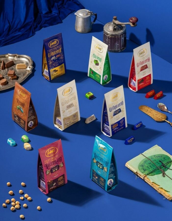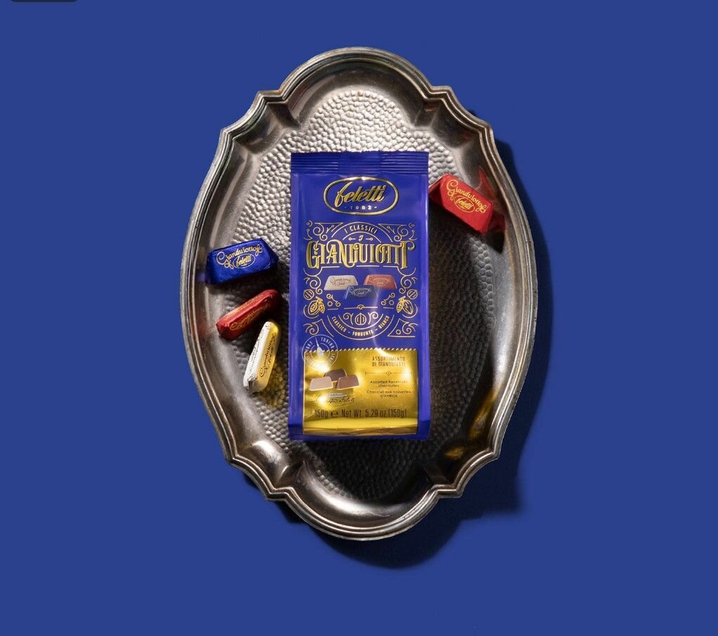 * Классические шоколадные конфеты Gianduia, они имеют форму перевернутые лодки и завернуты в золотую или серебряную фольгу. Их получают путем смешивания сахара, какао и специальные орехи под названием Tonda Gentile del Piemonte, типичные только для этого регион. Feletti - это итальянский бренд конфет, который производит широкий ассортимент конфет разных вкусов и форм. Они известны своей качественной продукцией и высоким уровнем вкуса. Feletti производит конфеты из различных видов шоколада, включая молочный, темный и белый, а также из орехов и сухофруктов.