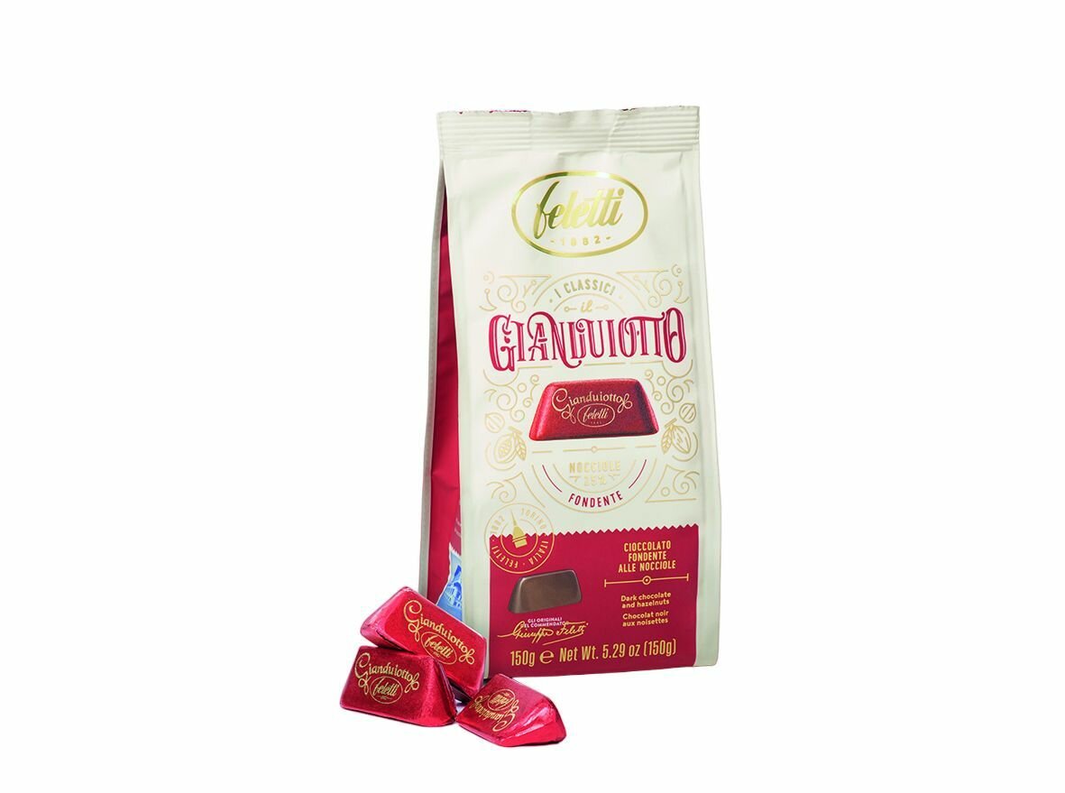 Итальянских шоколадных конфет Feletti Джандуйя Темный Шоколад: Конфеты в темном шоколаде Gianduia, Gianduiotto-это тип шоколада, типичный для северо-западной Италии (Пьемонт). Они имеют форму перевернутые лодки и завернуты в золотую или серебряную фольгу. Их получают путем смешивания сахара, какао и специальные орехи под названием Tonda Gentile del Piemonte, типичные только для этого региона. Feletti - это итальянский бренд конфет, который производит широкий ассортимент конфет разных вкусов и форм. Они известны своей качественной продукцией и высоким уровнем вкуса. Feletti производит конфеты из различных видов шоколада, включая молочный, темный и белый, а также из орехов и сухофрукт