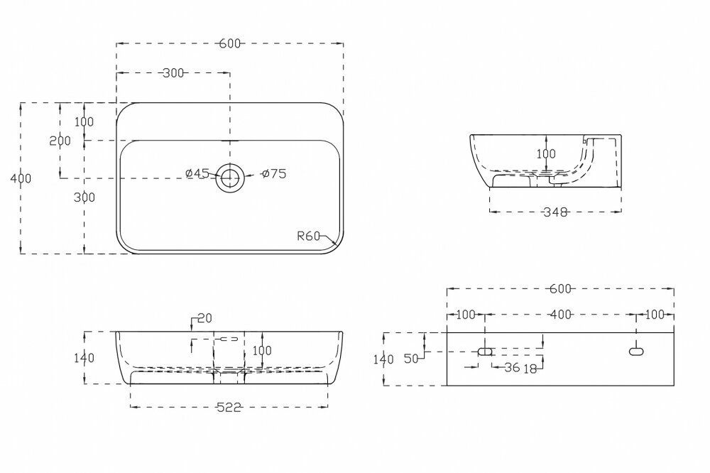 - Размеры (ШхВхГ): 600х140х400 мм.