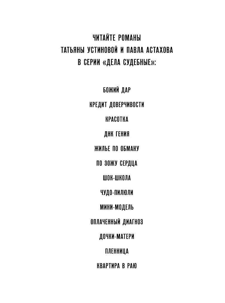 Звездный тандем Устинова—Астахов сложился много лет назад сначала на телевидении, а уже потом в литературе. Авторы продолжают поднимать в своих романах острые социальные вопросы и обличать вечные человеческие пороки. И, не отступая от собственного стиля, писатели продолжают радовать поклонников судебных историй живыми сюжетами, достоверными деталями и фирменной иронией — без которой не обходится ни один их роман из серии «Дела судебные».