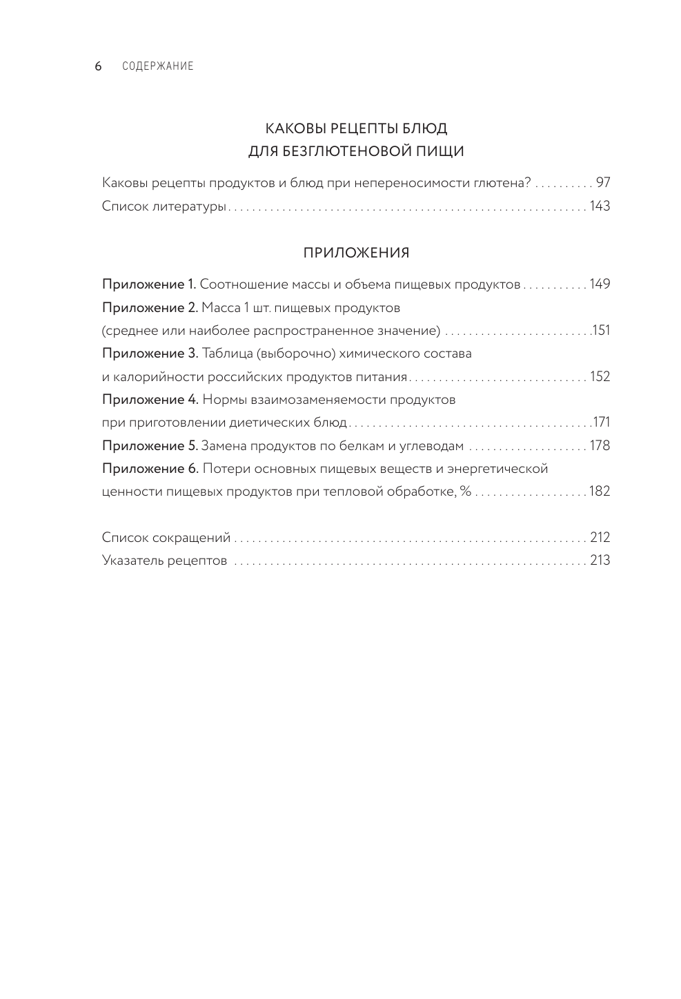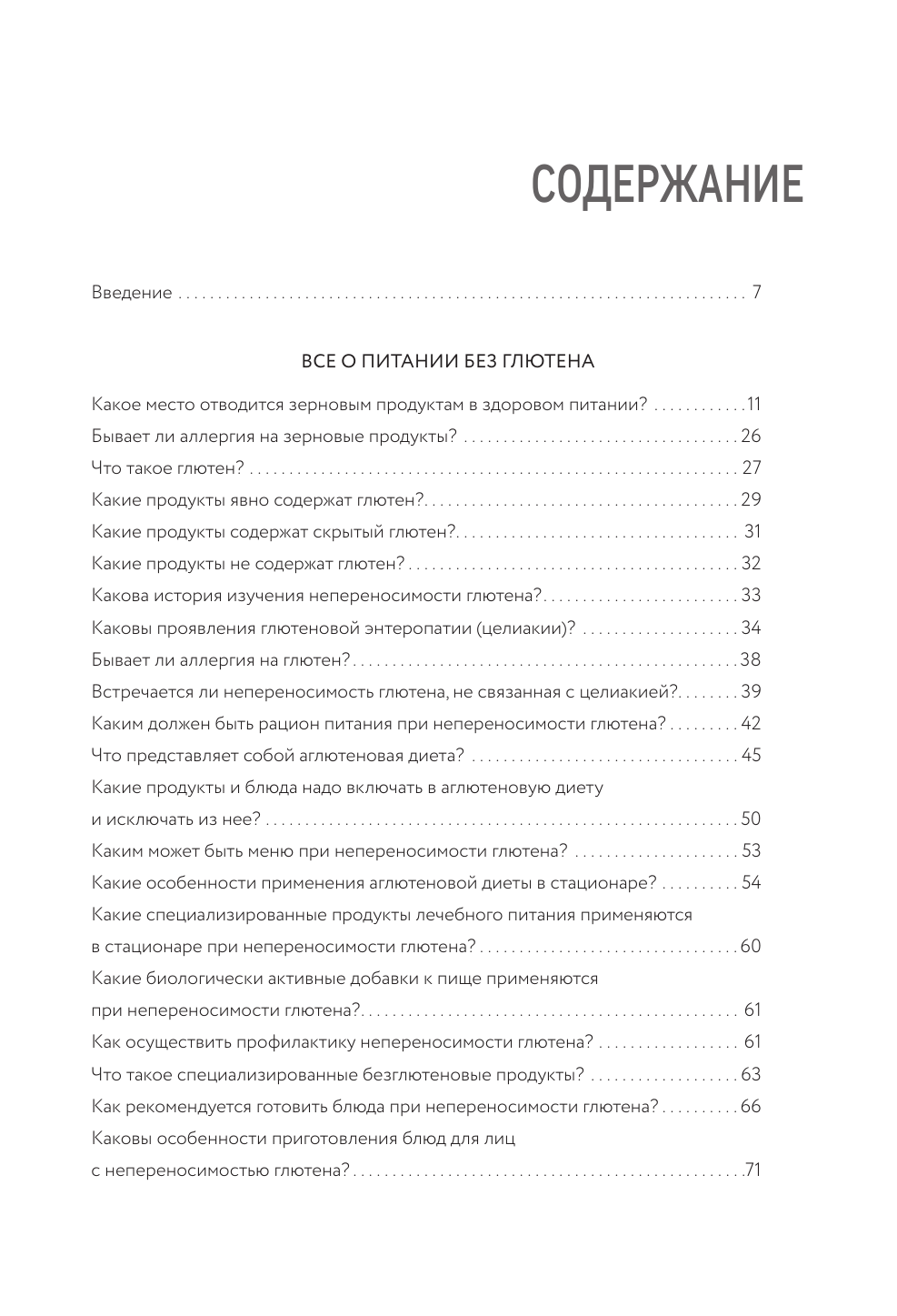 Главное в книге — большое количество рецептов, рекомендуемых при непереносимости отдельных пищевых продуктов различных групп, данных в обычном порядке их подачи — завтраки, закуски, первые блюда, вторые блюда, десерты, напитки, соусы. Рецепты блюд при непереносимости глютена отличают пониженное количество соли, сахара, острых и пряных приправ. Исключается такой способ кулинарной обработки, как жарка. Предпочтение отдается отвариванию, приготовлению блюд на пару.