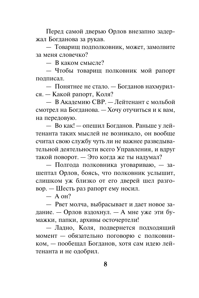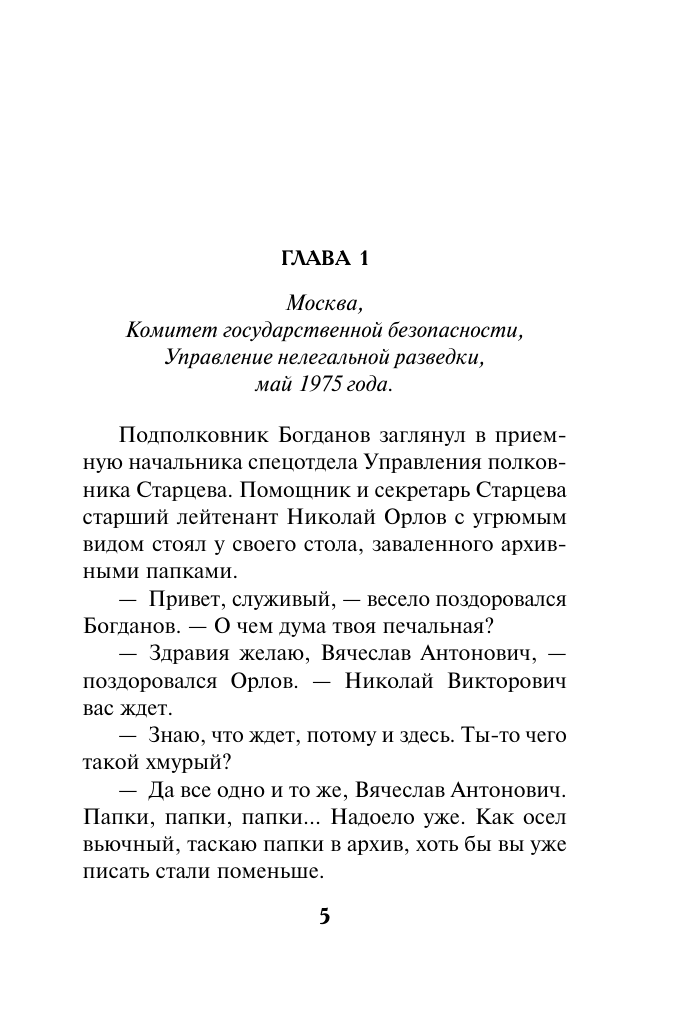Роман о напряженной работе специалистов уникального подразделения КГБ. От мозгового штурма при подготовке секретной операции до реальной схватки с коварным противником в любой точке земного шара — путь, который по силам только мужественным и преданным своему делу профессионалам.
