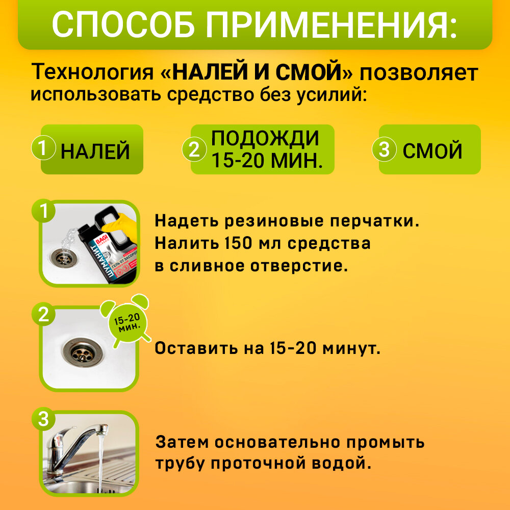 | Особенности | устранение запаха; устранение засоров от волос; щелочное |