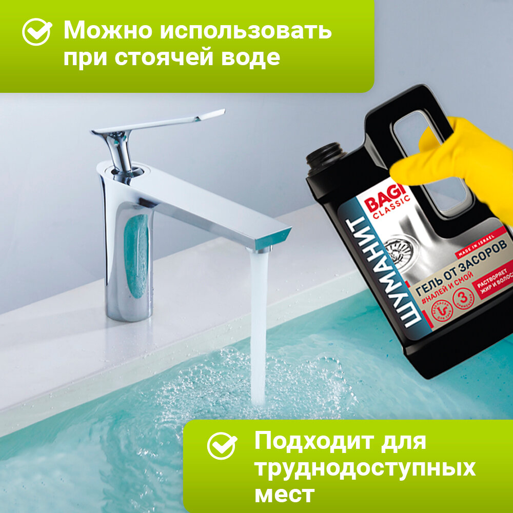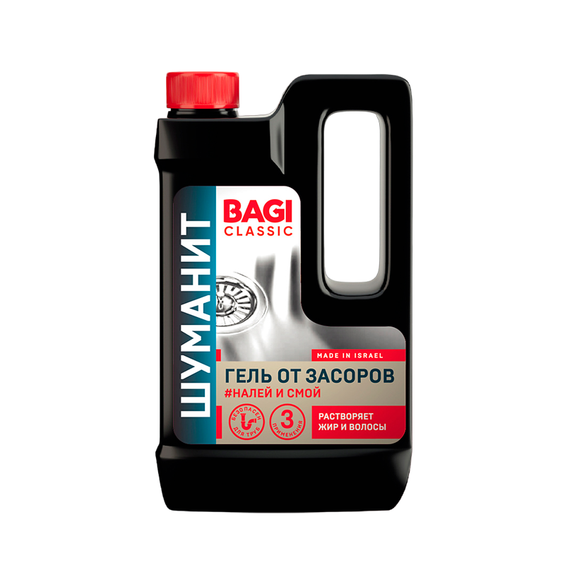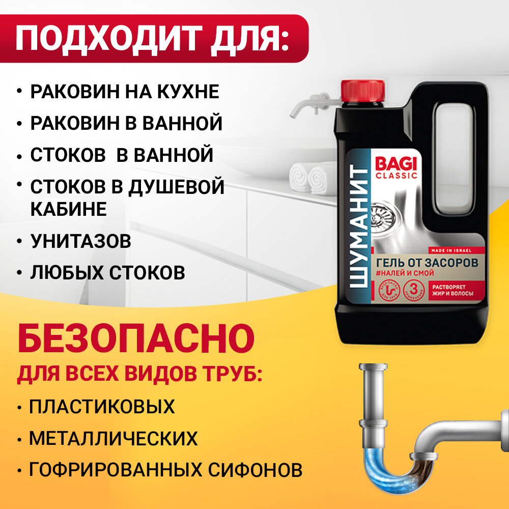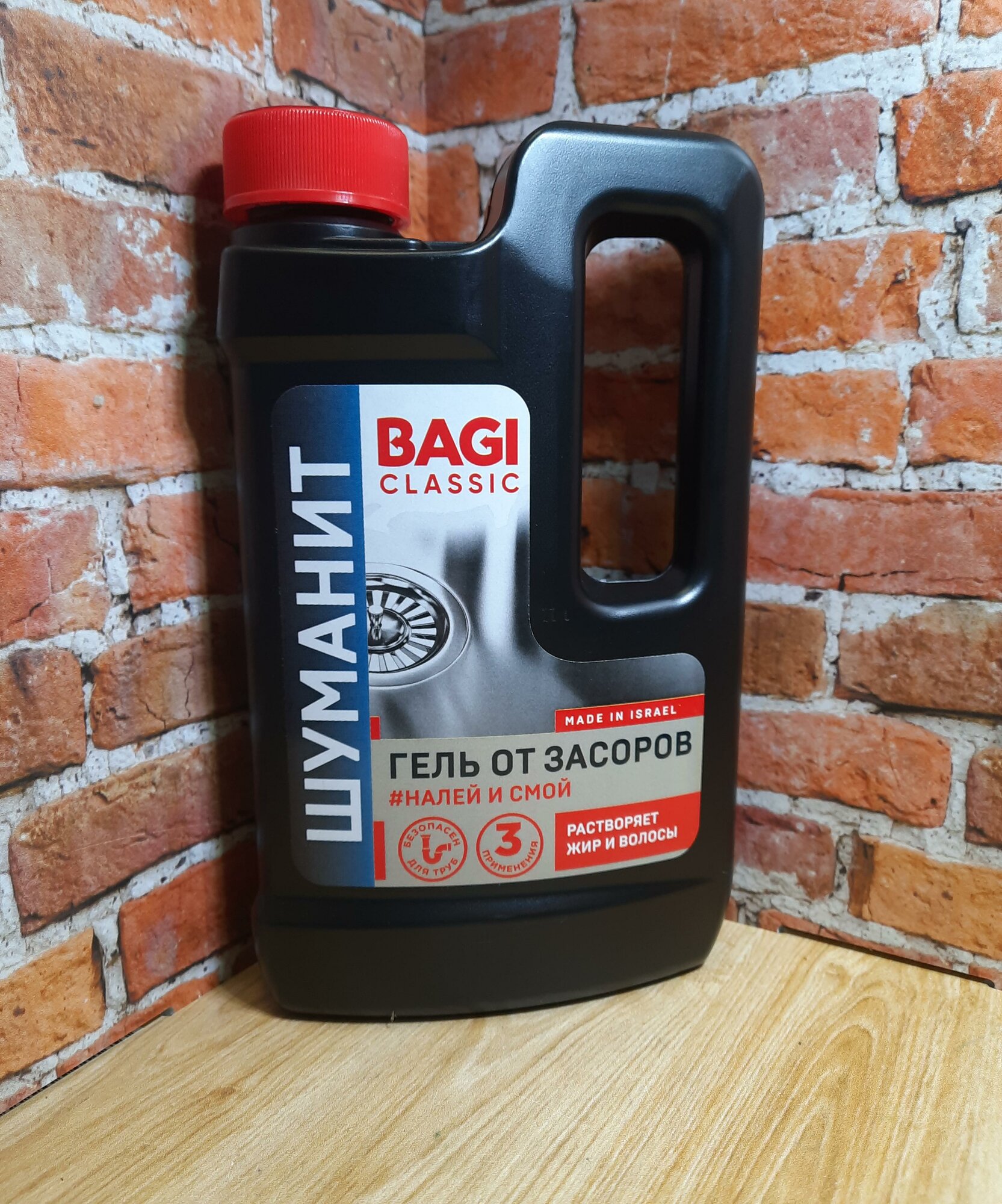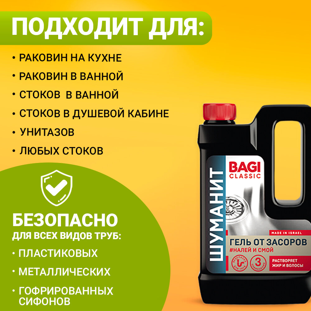 Шуманит гель от засоров Bagi Classic - концентрированное средство для устранения сложных засоров и прочистки канализационных и сточных труб. Уникальная формула геля быстро и эффективно устраняет сложные засоры из остатков пищи, кофейной гущи, жира, волос, шерсти и т.д. в раковине, на кухне, ванной, душевой кабине и унитазах. Полностью нейтрализует неприятные запахи из труб и стоковых отверстий. Технология «НАЛЕЙ И СМОЙ» позволяет использовать средство без дополнительных усилий. Если доступ к стоку и канализации затруднен и стоит вода, то густой гель будет идеальным вариантом для чистки труб от засор в стоячей воде. Безопасно для всех видов труб: пластиковых, металлических, в том числе и гофрированных сифонах. Для профилактики рекомендуется применять не реже 1 раза в месяц, что позволит избежать проблем с механической чисткой стоков.