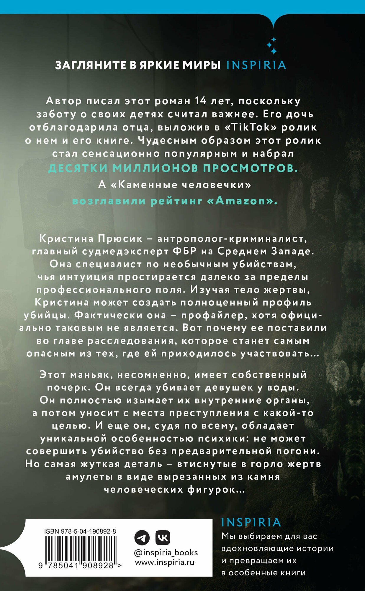 СЕНСАЦИЯ TikTok. БЕСТСЕЛЛЕР № 1 AMAZON. Кристина Прюсик - антрополог-криминалист, главный судмедэксперт ФБР на Среднем Западе. Она специалист по необычным убийствам, чья интуиция простирается далеко за пределы профессионального поля. Изучая тело жертвы, Кристина может создать полноценный профиль убийцы. Фактически она - профайлер, хотя официально таковым не является. Вот почему ее поставили во главе расследования, которое станет самым опасным из тех, где ей приходилось участвовать. Этот маньяк, несомненно, имеет собственный почерк. Он всегда убивает девушек у воды. Он полностью изымает их внутренние органы, а потом уносит с места преступления с какой-то целью. И еще он, судя по всему, обладает уникальной особенностью психики: не может совершить убийство без предварительной погони. Но самая жуткая деталь - втиснутые в горла жертв амулеты в виде вырезанных из камня человеческих фигурок. Автор писал этот роман 14 лет, поскольку заботу о своих детях считал важнее. Его дочь отблагодарила отца, выложив в «TikTok» ролик о нем и его книге. Чудесным образом этот ролик стал сенсационно популярным и набрал десятки миллионов просмотров. А «Каменные человечки» возглавили рейтинг «Amazon», обогнав даже мемуары принца Гарри.