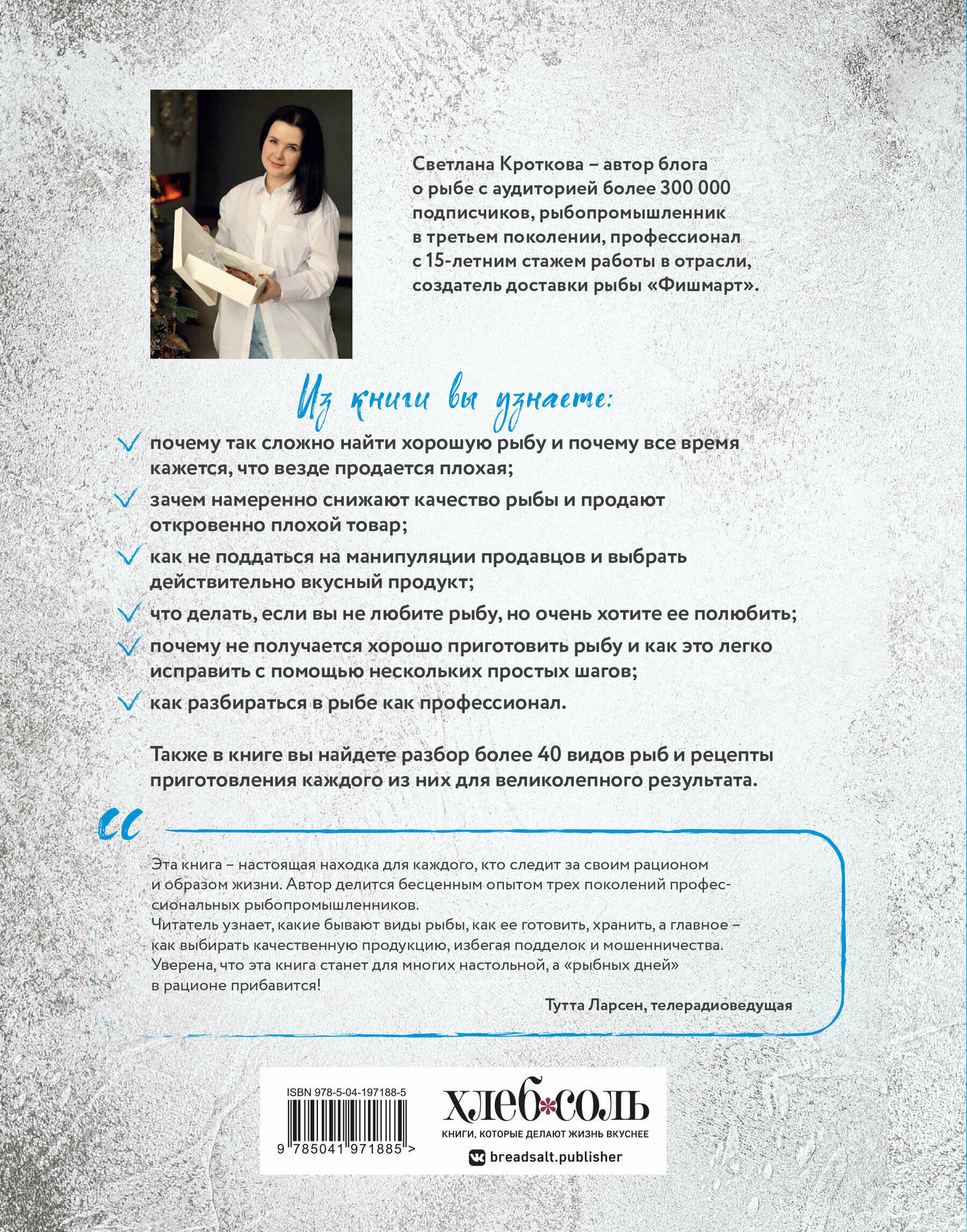 Светлана Кроткова - автор блога о рыбе с аудиторией более 300 000 подписчиков, рыбопромышленник в третьем поколении, профессионал с 15-летним стажем работы в отрасли, создатель доставки рыбы «Фишмарт». Из книги вы узнаете: - Почему так сложно найти хорошую рыбу и почему все время кажется, что везде продается плохая. - Зачем намеренно снижают качество рыбы и продают откровенно плохой товар. - Как не поддаться на манипуляции продавцов и выбрать действительно вкусный продукт. - Что делать, если вы не любите рыбу, но очень хотите ее полюбить. - Почему не получается хорошо приготовить рыбу и как это легко исправить с помощью нескольких простых шагов. - Как разбираться в рыбе как профессионал. Также в книге вы найдете разбор более 40 видов рыб и рецепты приготовления для каждого из них для великолепного результата.