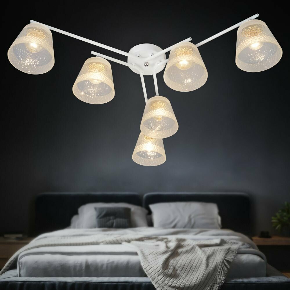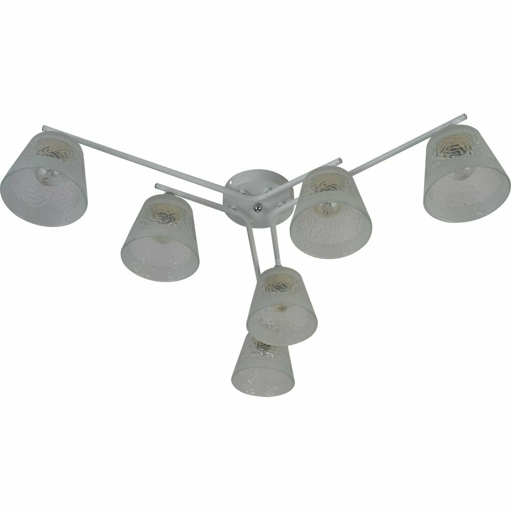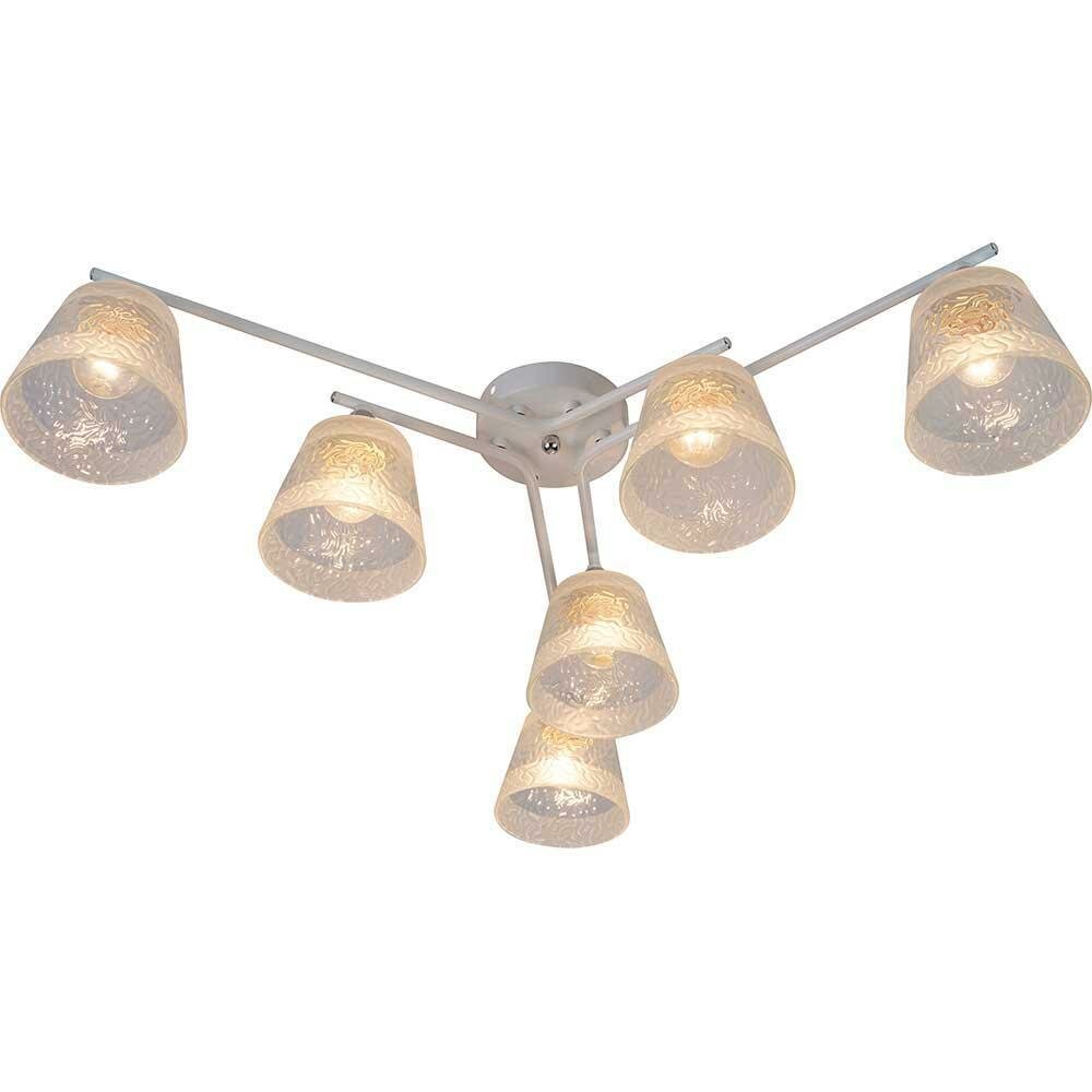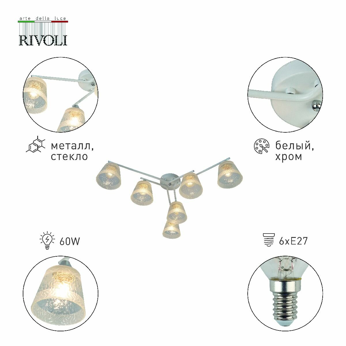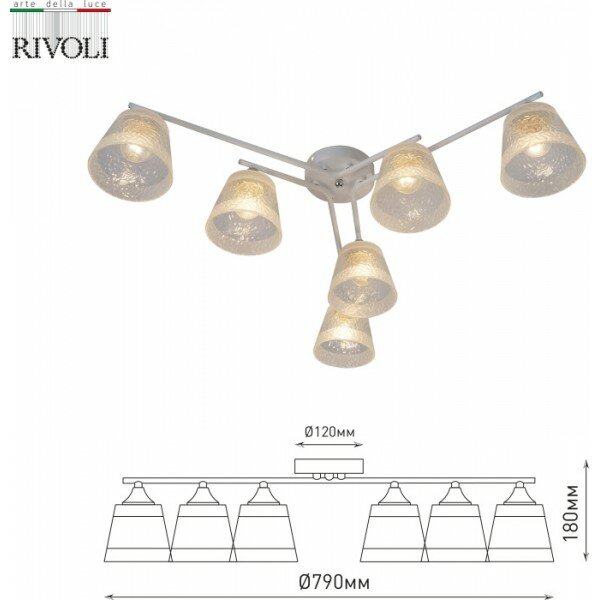 Rivoli Constance (арт. ) – люстра потолочная под 6 ламп Е27 60 Вт. Люстра в белом цвете идеально подходит для современных интерьеров. В коллекции Constance итальянского бренда Rivoli есть также люстра под 4 лампs – арт. 3155-304. Люстры белые потолочные – настоящий тренд в оформлении жилых пространств.Люстра из металла Constance Rivoli качественно освещает площадь до 18 м2. Такая потолочная люстра хорошо смотрится в небольших жилых комнатах – люстра на кухню, люстра в спальню. Прозрачные стеклянные плафоны люстры имеют красивый рифлёный рисунок и декорированы матовыми полосами.