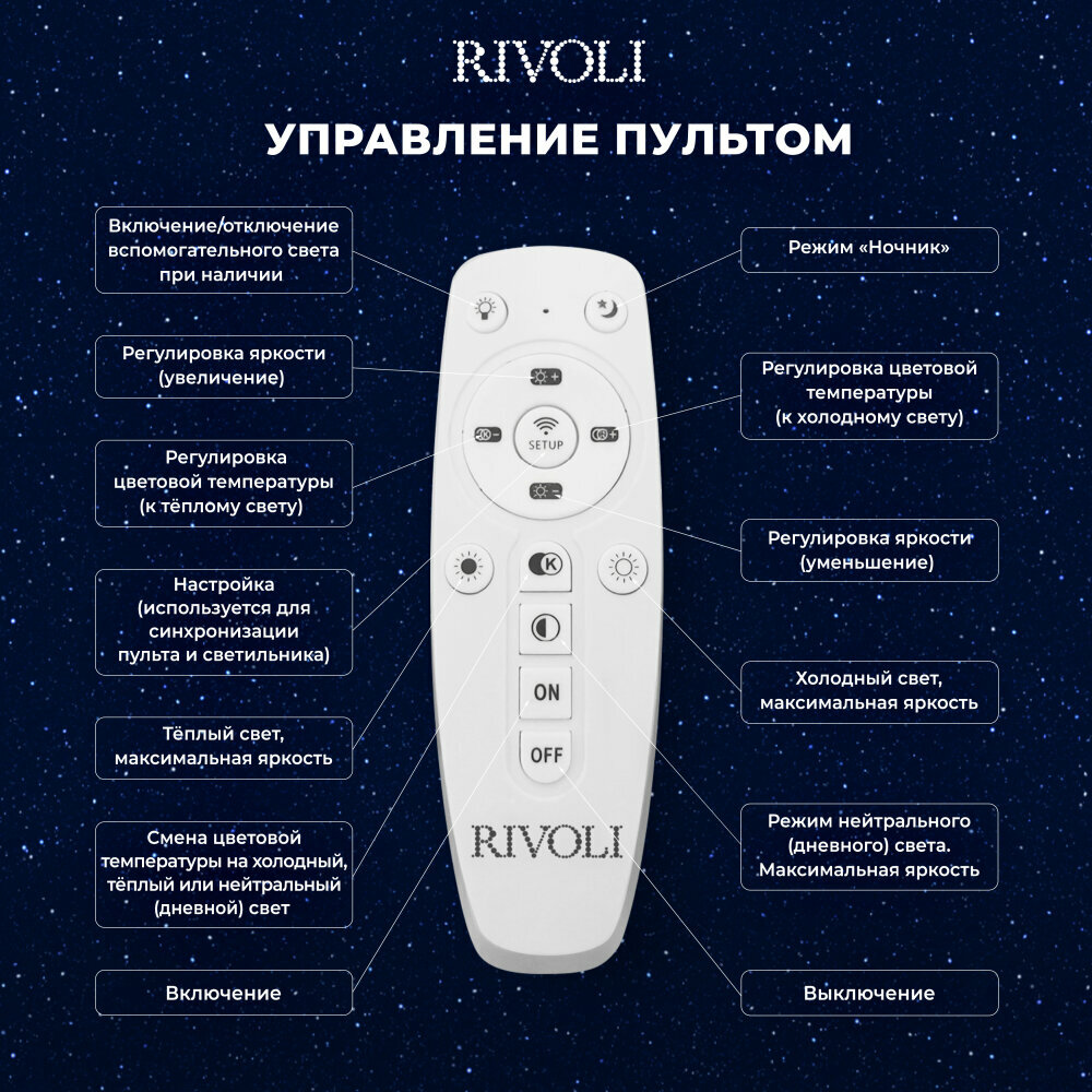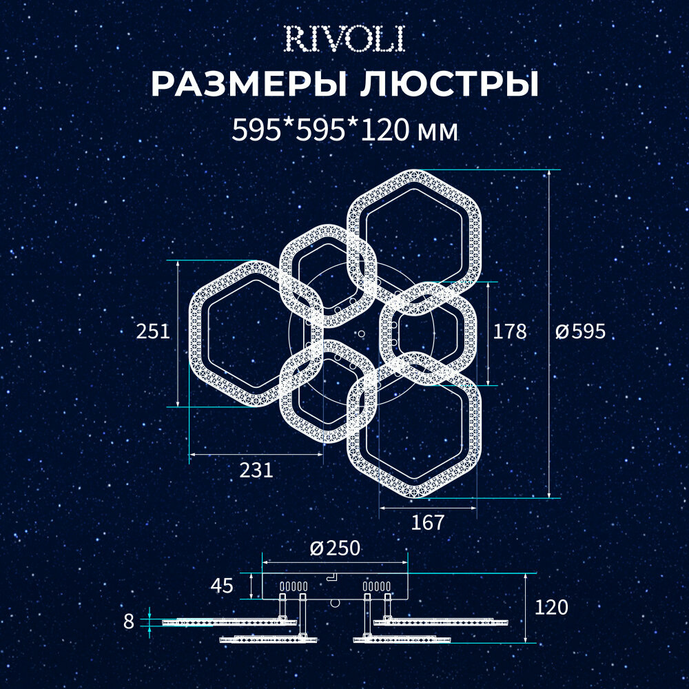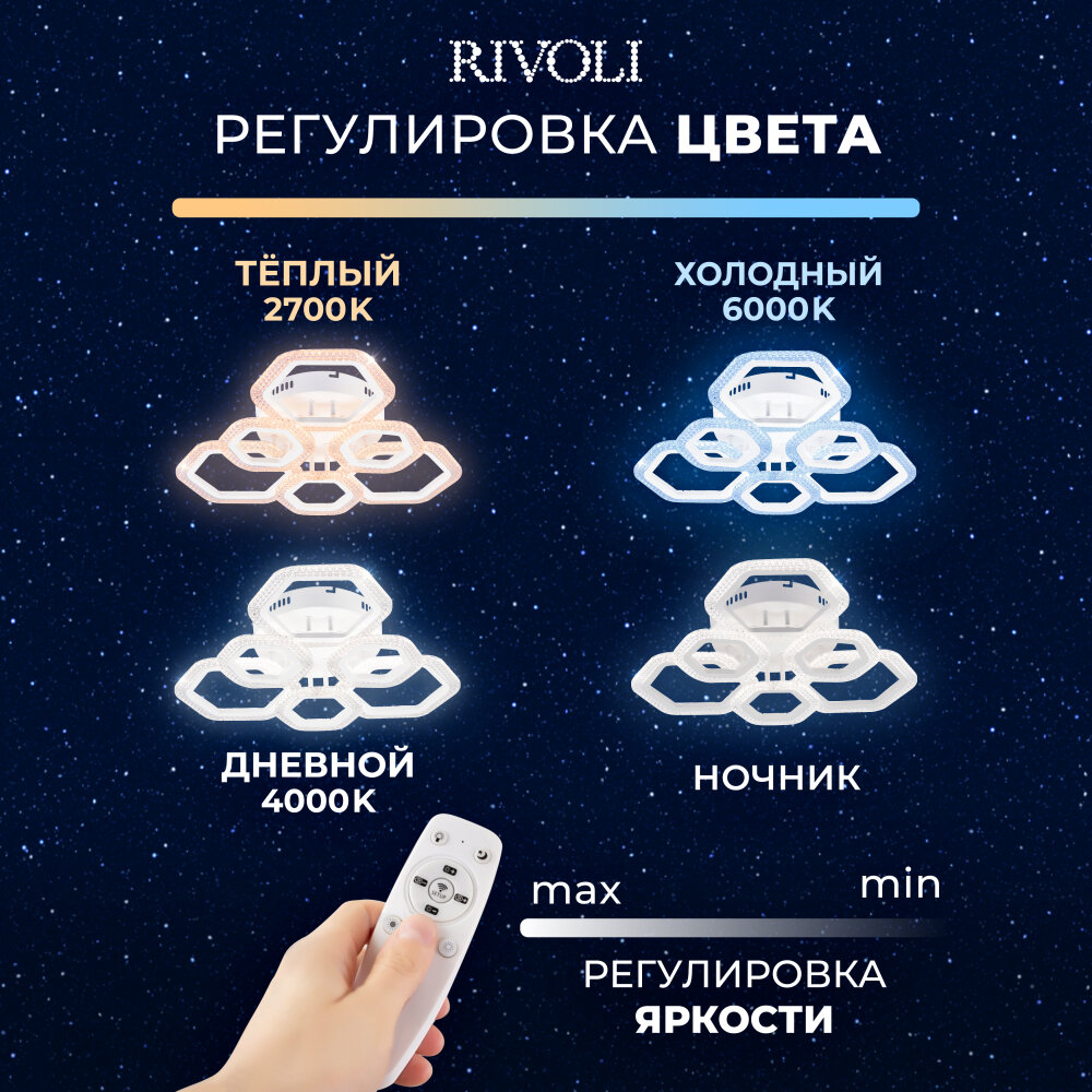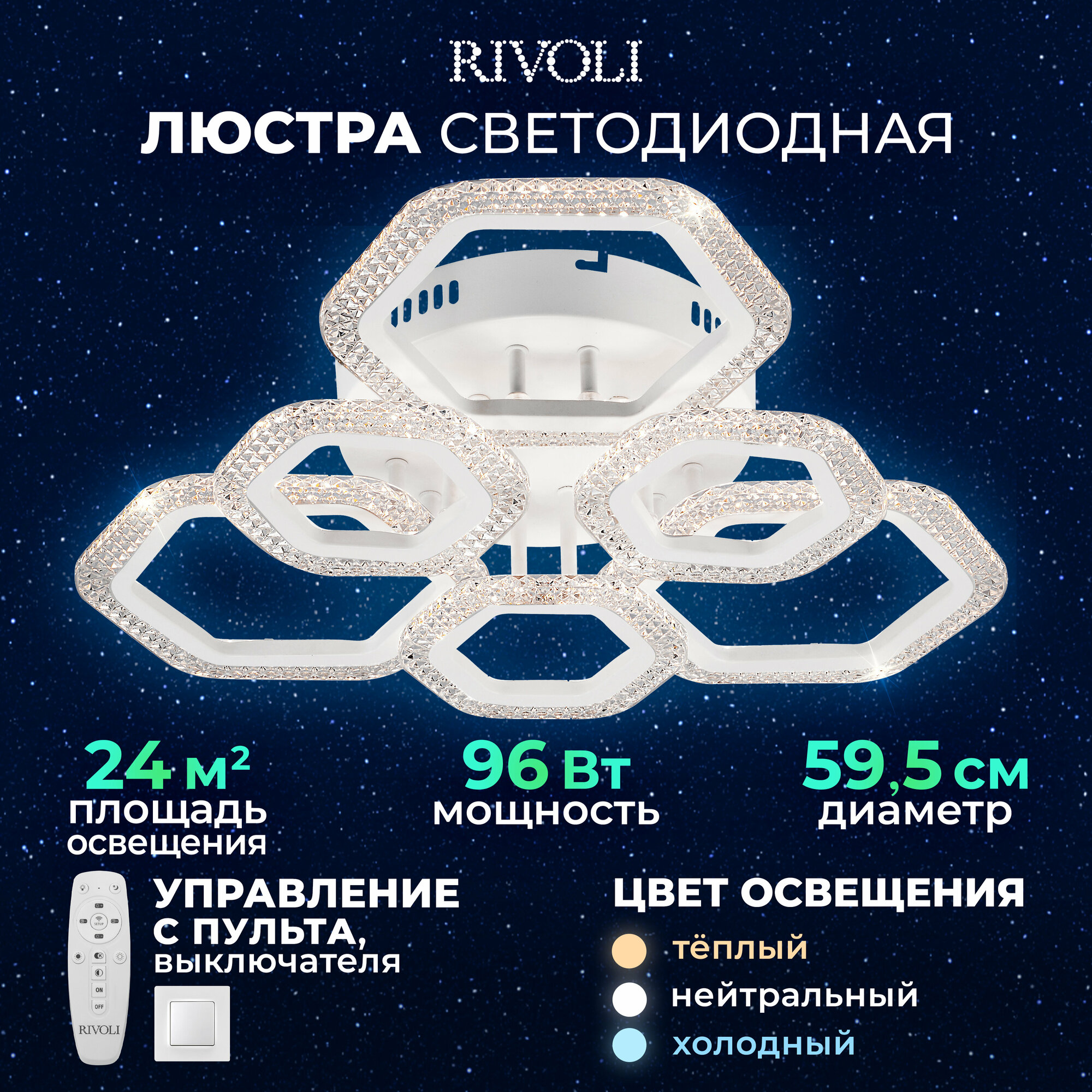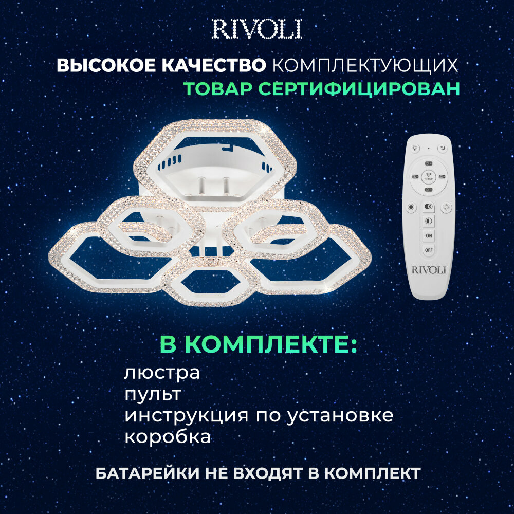 Светильник-люстра светодиодная с шестью LED плафонами в форме сот – Rivoli Nancy (арт. ). Белый потолочный светодиодный светильник с пультом дистанционного управления. Люстра потолочная светодиодная с регулировкой яркости и цветовой температуры освещения. Мощность этой современной люстры – 96 Вт. Потолочный светодиодный светильник Rivoli Nancy подходит для организации основного освещения в гостиной, спальне, в загородном доме, в квартире-студии. Разные режимы свечения светодиодов позволяют комфортно чувствовать себя в пространстве. Коллекцию дополняют люстры LED светодиодные потолочные с пультом – арт. 6111-105, 6111-103, 6111-104, 6111-101. К заказу доступен также настенный светодиодный LED светильник Rivoli Nancy – арт. 6111-401.