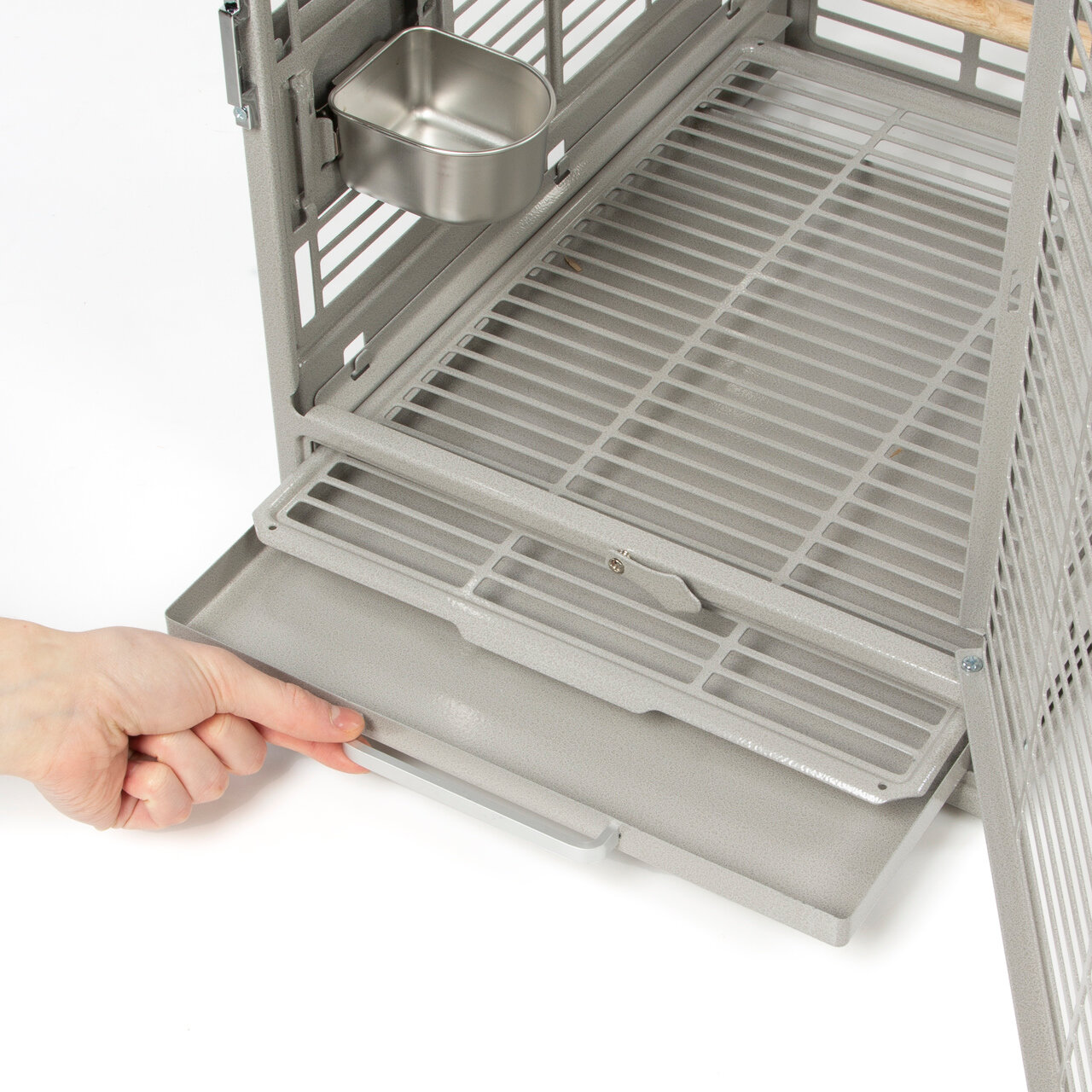 Комплект клетки включает удобную деревянную жердочку и две прочные кормушки из нержавеющей стали с внешним доступом. Они легко монтируются на стенках и создают комфортные условия для птицы во время перевозки. Пол представляет собой два выдвижных поддона: верхний сетчатый и нижний в виде лотка. Их можно без труда извлечь и очистить в течение нескольких минут, так что у вас не будет проблем с наведением порядка. А ещё ваша птичка сможет весело проводить досуг вне клетки, используя деревянную жердочку на крыше.