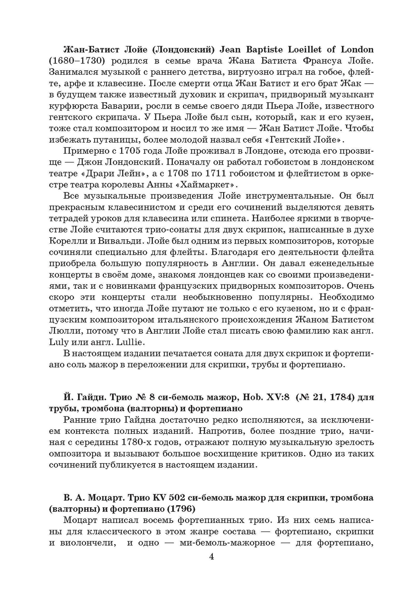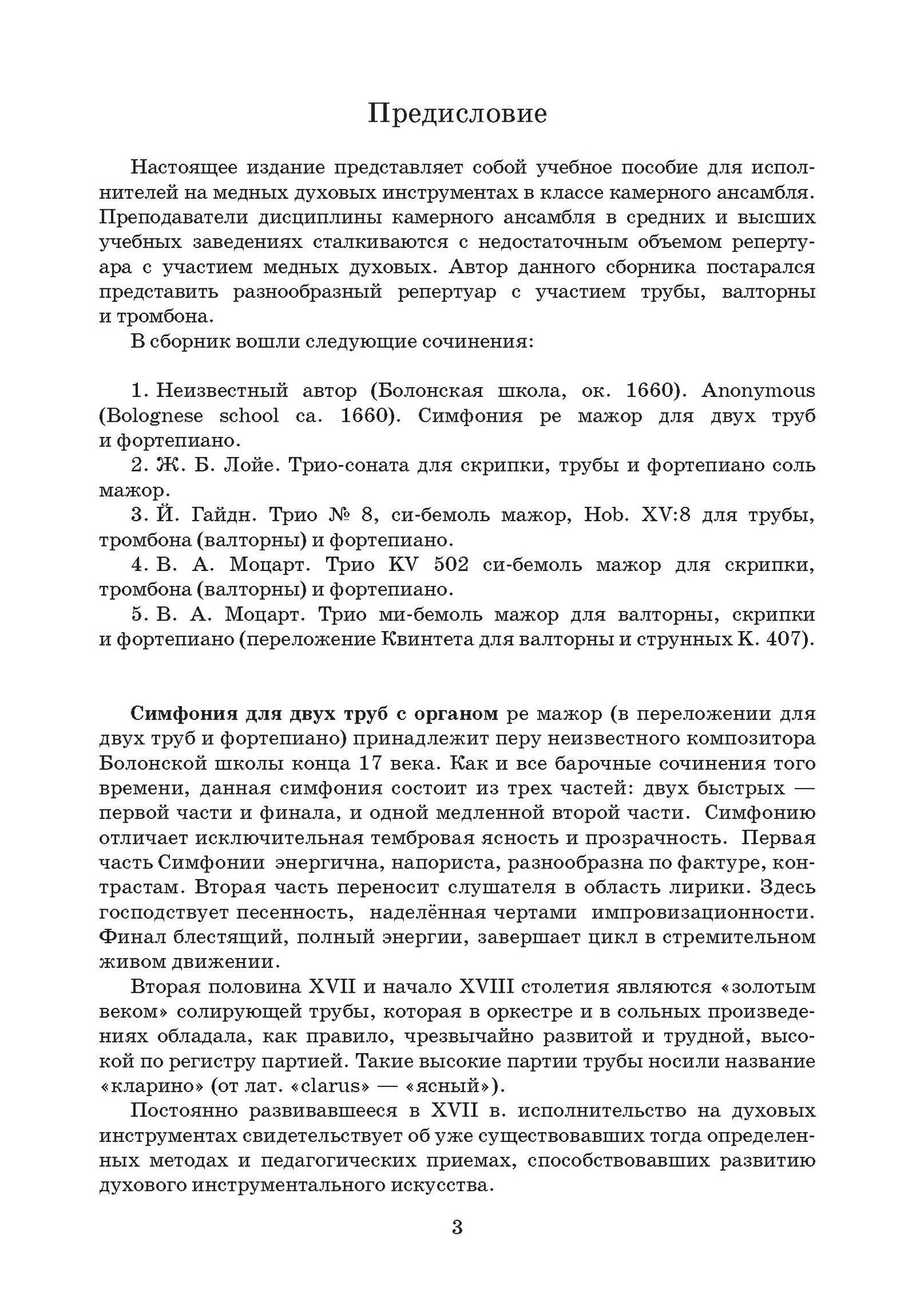 Настоящее учебное пособие предназначено для студентов класса камерного ансамбля музыкальных училищ и консерваторий, исполнителей на медных духовых инструментах. В последние годы проблема репертуара в классе камерного ансамбля для студентов - исполнителей на медных духовых инструментах стоит очень остро. Данное издание транскрипций и переложений сочинений эпох барокко и классицизма частично может решить обозначенную проблему, позволив ознакомить обучающихся с камерными произведениями Ж. Б. Лойе, Й. Гайдна и В. А. Моцарта. Неоспоримая художественная ценность отобранных произведений и высокое качество переложений гарантируют удовольствие от игры в ансамбле как профессионалам, так и любителям камерного музицирования. Составители: Р. В. Глазунова, В. И. Глазунов.