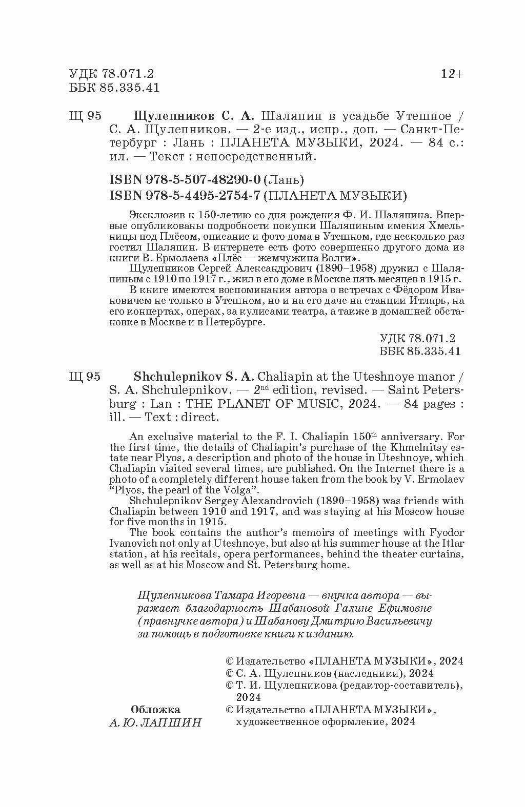Эксклюзив к 150-летию Ф. И. Шаляпина. Впервые опубликованы подробности покупки Шаляпиным имения Хмельницы под Плесом, описание и фото дома в Утешном, где несколько раз гостил Шаляпин. В интернете есть фото совершенно другого дома из книги В. Ермолаева «Плес - жемчужина Волги». Щулепников Сергей Александрович (1890-1958) дружил с Шаляпиным с 1910 по 1917. Жил в его доме в Москве 5 месяцев в 1915. В книге воспоминания автора о встречах с Федором Ивановичем не только в Утешном, но и на его даче на станции Итларь, на его концертах, операх, за кулисами театра, а также в домашней обстановке в Москве и в Петербурге. 2-е издание, исправленное и стереотипное.