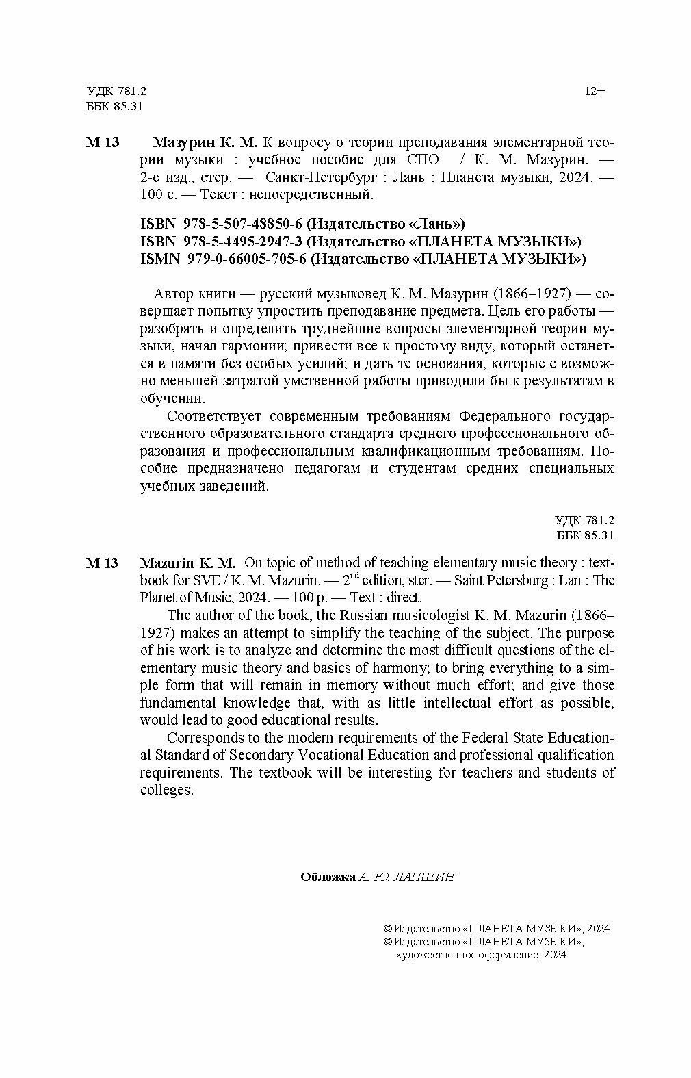 К вопросу о способе преподавания элементарной теории музыки. Учебное пособие для СПО (Мазурин Павел Иванович); Планета Музыки, 2024