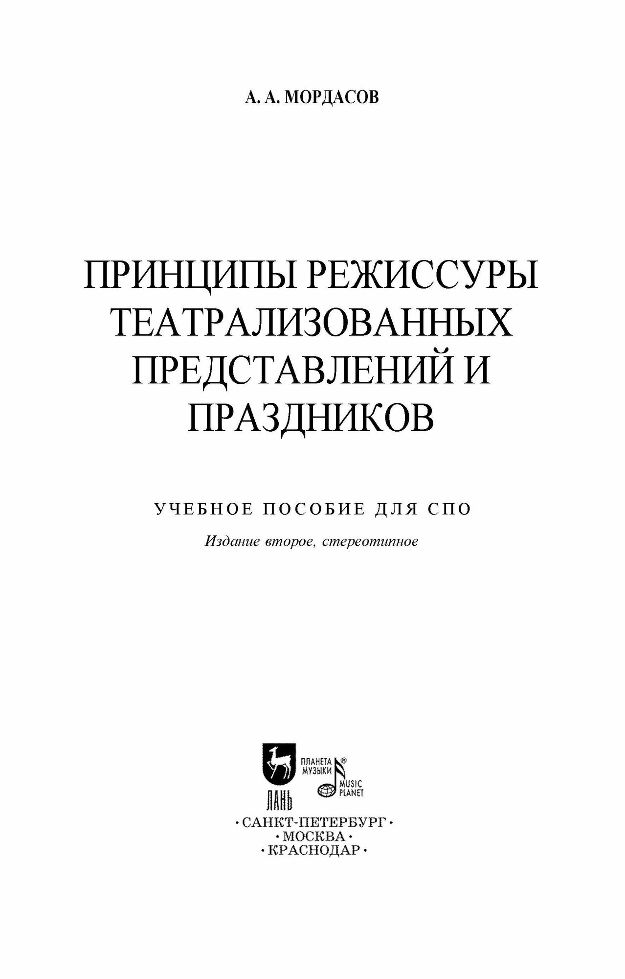 Принципы режиссуры театрализованных представлений и праздников. Учебное пособие по СПО (Мордасов Александр Алексеевич); Планета Музыки, 2024