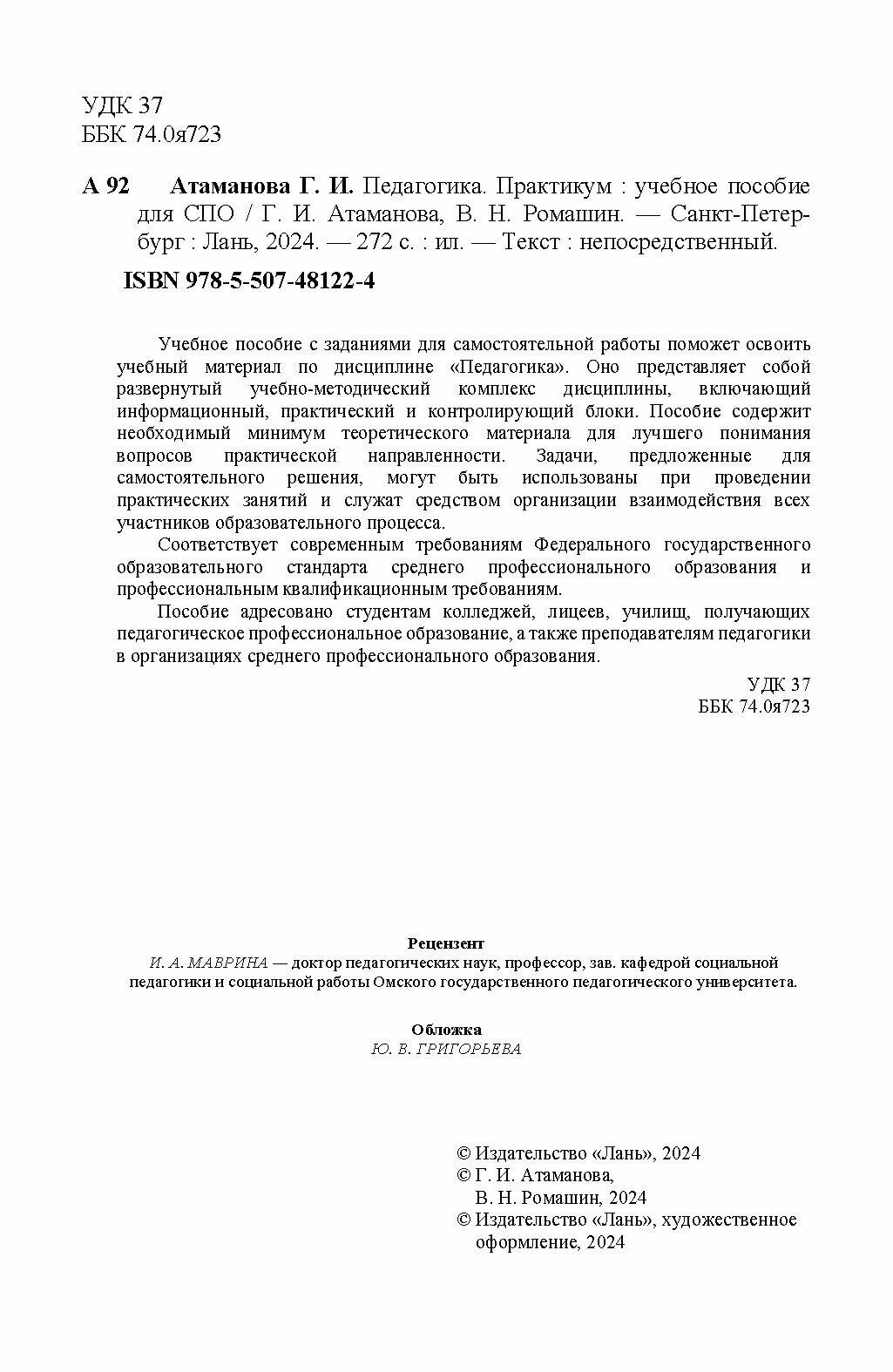 Педагогика. Практикум. Учебное пособие для СПО (Атаманова Галина Ивановна, Ромашин Владимир Николаевич); Лань, 2024