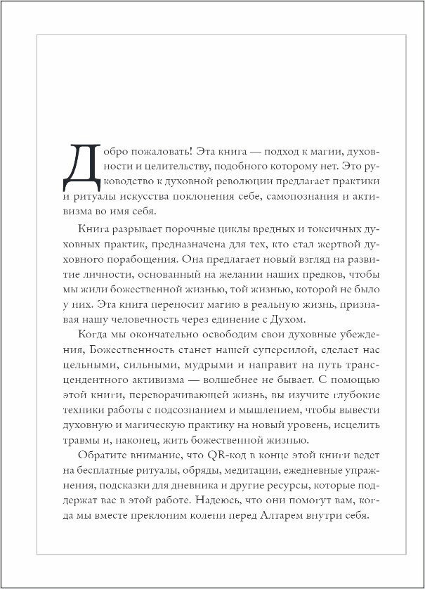 Новая книга Джульетты Диас - абсолютно новый подход к духовности и магии. Она для тех, кто больше не верит во всемогущие «высокие вибрации», «магический позитив» и тренинги «сбычи мечт». Пришло время расстаться с токсичными, бесполезными и разорительными духовными практиками и обратиться к истинному источнику силы и магии - САМОЙ СЕБЕ. В этой книге вы найдете: - Абсолютно новый подход к духовности и магии, где ты - свой собственный алтарь и источник магии. - Советы, как наладить и поддерживать связь со своими предками и их традициями. - Рекомендации, как построить по-настоящему здоровые и гармоничные отношения с собой. - Повседневные ритуалы-практики для активной заботы о себе и своем Божественном «Я». - «Дневник самоанализа» для истинного самопознания и принятия себя. Джульетта Диас - потомственная ведьма кубинского происхождения, целительница, провидица, специалист по травам, дипломированный фитотерапевт. Ее дар проявился в возрасте трех лет, когда она обрела общаться с растениями, деревьями и духами природы. Джульетта - автор многочисленных статей и книг «Магия. Практическое руководство для современной ведьмы» и «Магия растений». Она - мама двух мальчиков, хозяйка трех кошек и более 400 растений.