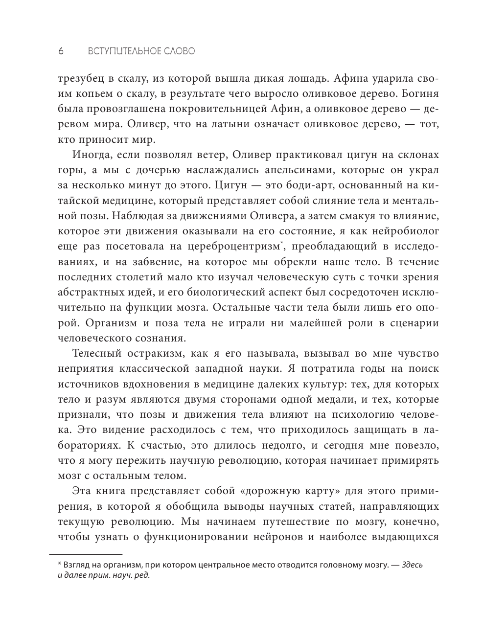 Джордж Оруэлл говорил, что главное не остаться в живых, а остаться человеком. В течение последних столетий западная медицина упорно учила нас воспринимать тело фрагментарно. Даже врачи у нас занимались в основном каким-то одним органом. При этом главенство в теле бескомпромиссно отдавалось мозгу, а все остальное - лишь управляемые им элементы. В этом смысле восточная медицина стояла особняком (и не признавалась официальной) - ведь она воспринимала тело как единство: организм и разум здесь являлись и являются двумя сторонами одной медали, а позы и движения тела влияют на психологию человека. Однако все изменилось - сейчас мы на пороге революции: тело наконец-то примирилось с мозгом. Эта книга представляет собой дорожную карту для этого примирения. - Вы начнете путешествие по мозгу и узнаете о функционировании нейронов. - Прочитаете о наиболее выдающихся областях мозга, имеющих особенное значение во взаимоотношениях с организмом. - Узнаете, как кожа, жесты и позы тела формируют эмоции и отношение к окружающей действительности. - Откроете для себя океан микроорганизмов, населяющих наш кишечник и формирующих психологические факторы роста нейронов, без которых не возник бы процесс их изучения. - Увидите, как дыхание влияет на нейронную деятельность и накладывает отпечаток на внимание, память, а также на выражение эмоций и как помогает делать нейроны пластичными. - Поймете, как сердцебиение влияет на активность нейронов в областях мозга, наиболее вовлеченных в субъективное восприятие реального мира. И, конечно, научитесь использовать эти знания в реальной жизни в бытовых ситуациях: чтобы успокоиться, сконцентрироваться, расслабиться или ощутить прилив энергии.