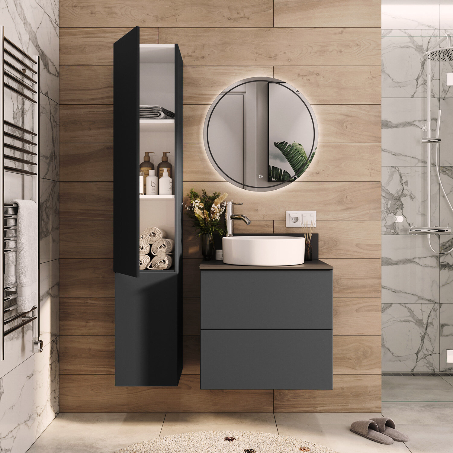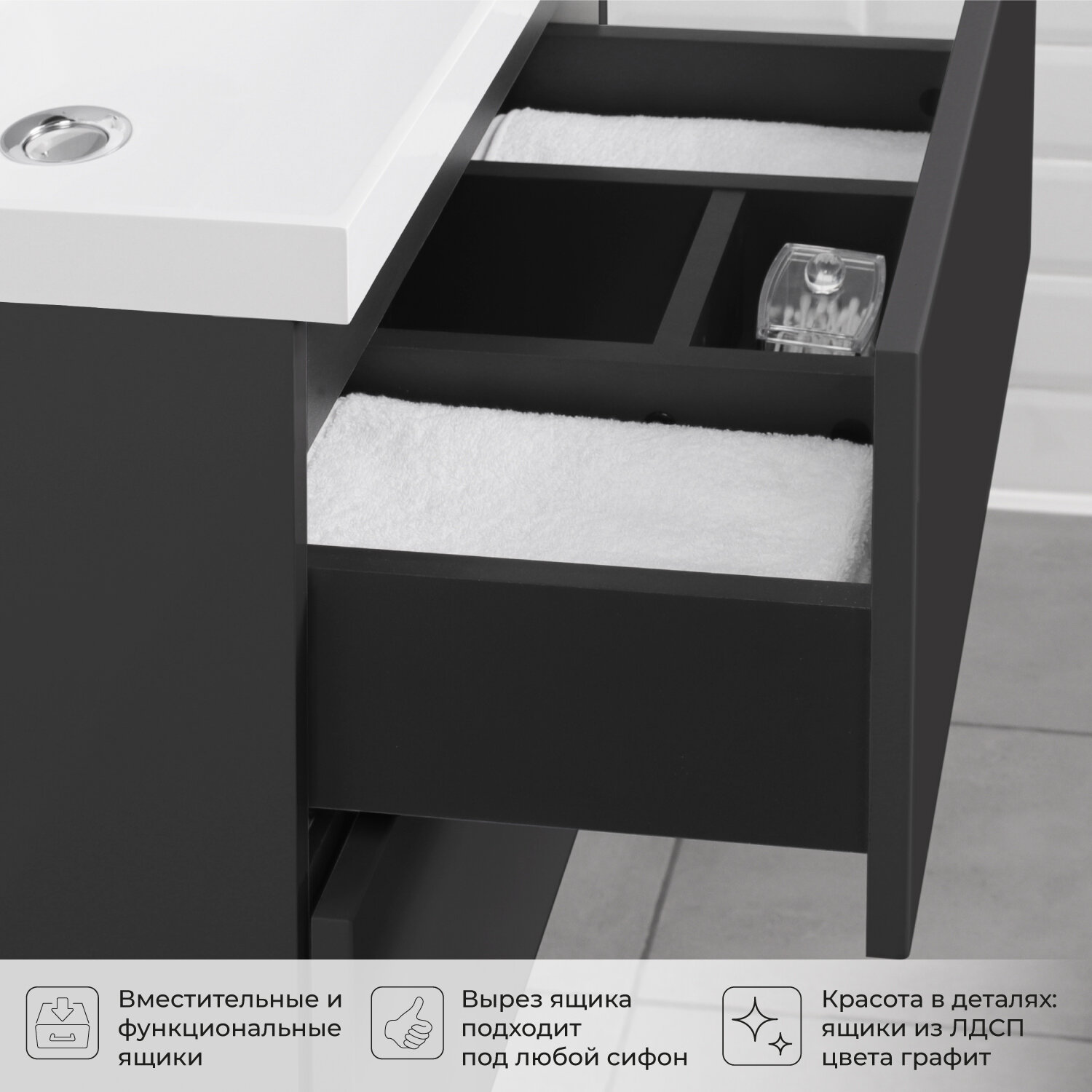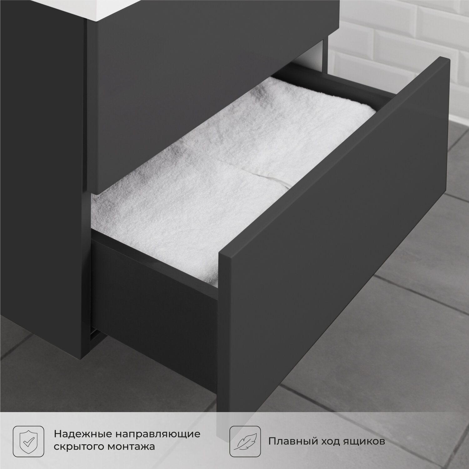 Белоснежная глянцевая мебель из коллекции добавит ощущения чистоты и безупречности в современный интерьер ванной комнаты. Тумба со столешницей выполнена из влагозащищенного МДФ, корпус и фасады покрыты высокоглянцевой ПВХ-пленкой. Система push-to-open позволяет открывать выдвижные ящики простым нажатием на фасад. Качественные направляющие скрытого монтажа обеспечат плавное открывание и закрывание ящичка. То есть, при небольшом надавливании, ящик немного выдвинется наружу. Главное преимущество системы: отсутствие ручек на фасадах. Подвесной способ установки обеспечивает легкую уборку в ванной комнате. Идеальные прямые линии, вкладные фасады, тонкая рамка корпуса, лаконичность, которая восхищает. Такая мебель удовлетворит потребности покупателей в функциональности, но не будет забирать все внимание на себя.