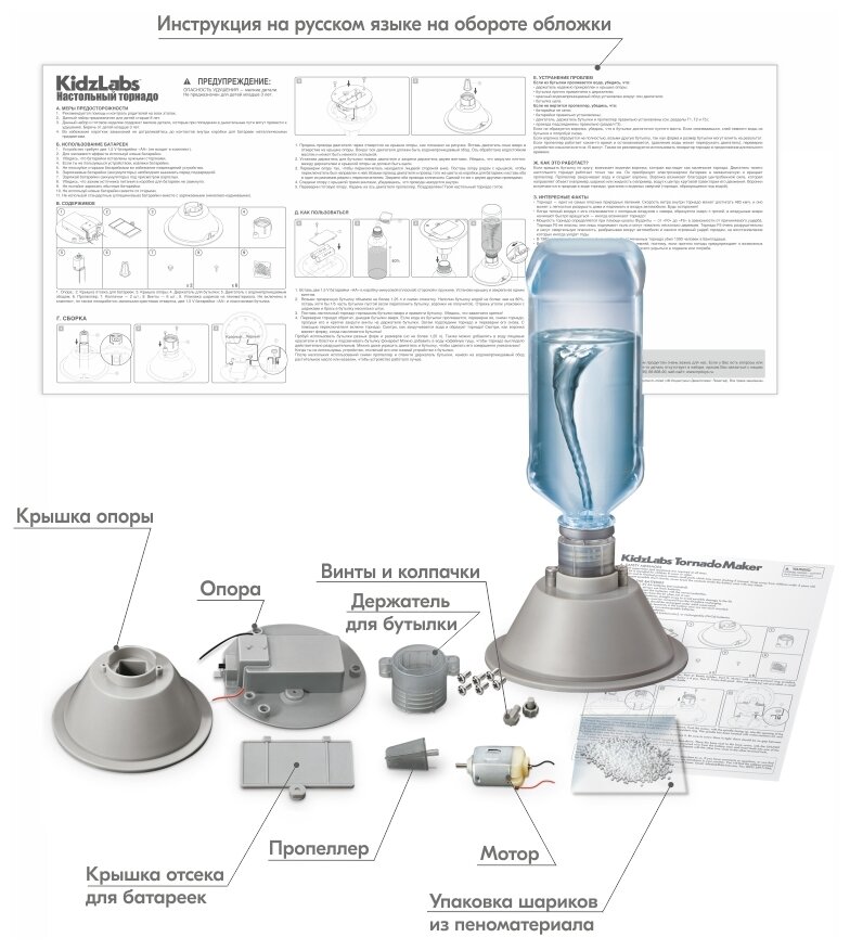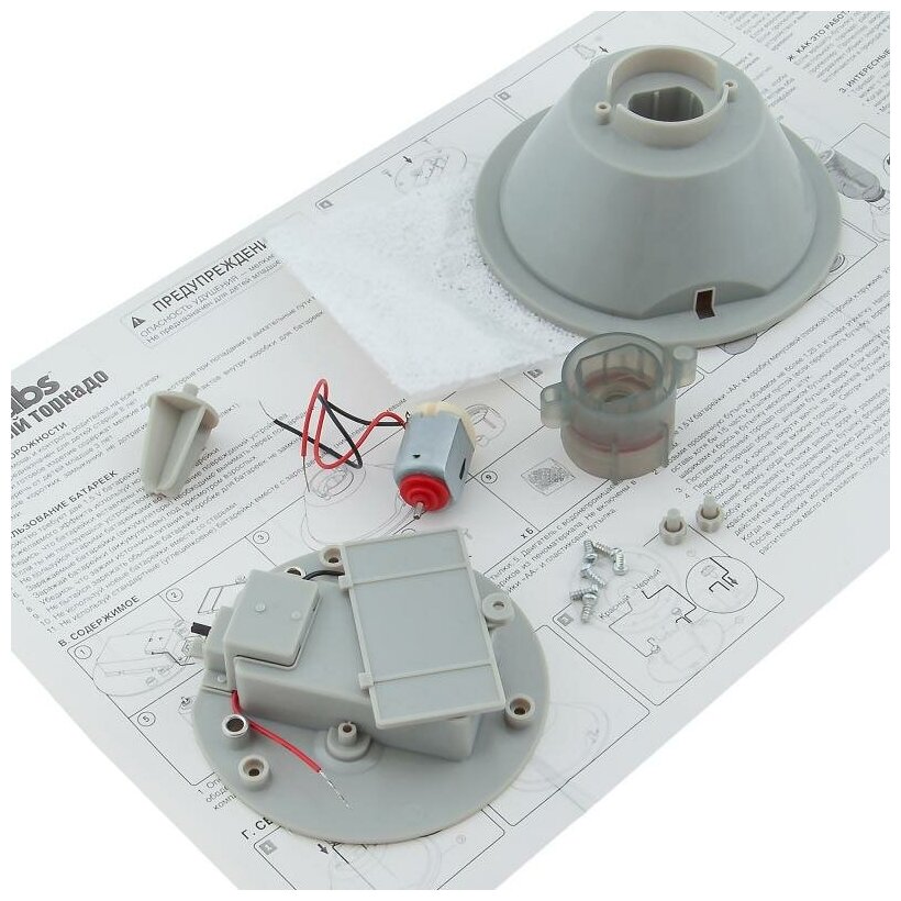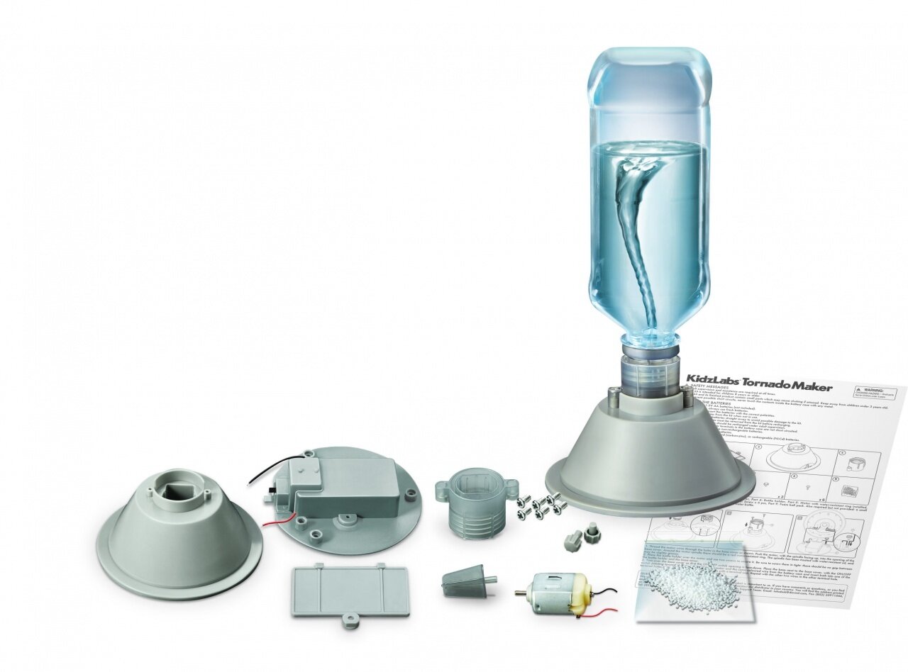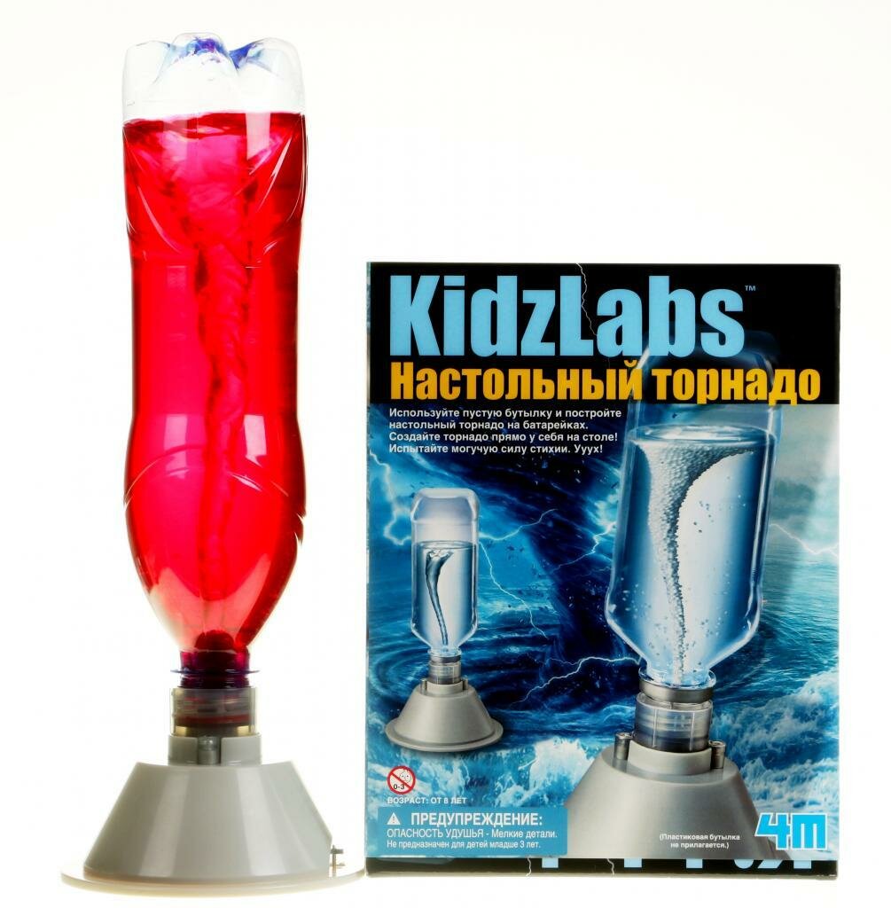 Настольный торнадо - детский научный набор, который позволит Вашему ребёнку создать настоящий торнадо у себя на столе. Этот набор развивает логику, интеллектуальные способности ребёнка, стимулирует интерес к науке. Набор выполнен из безопасных материалов. Дополнительно понадобятся крестовая отвертка, бутылка с водой, понадобятся 2 батарейки типа AA.