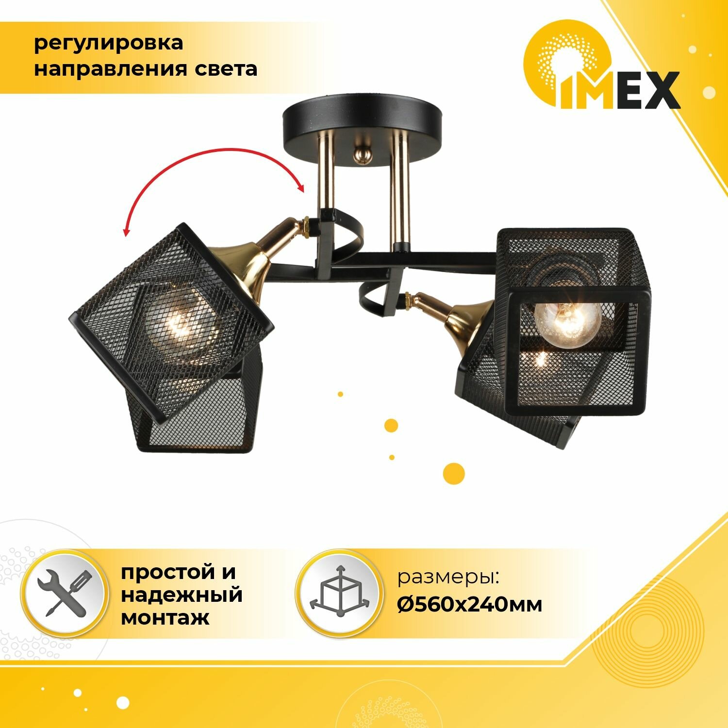 Потолочная люстра IMEX бренда IMEX из Германии в стиле Лофт. Одна из зон рекомендованных к размещению (необязательно) В спальню. Место расположения - На потолок. Материал плафона/абажура - Металл. Цвет плафона/абажура - Черный. Форма плафона - Квадратный. Направление абажуров/плафонов: Поворотное. Количество плафонов/абажуров - 4. Материал арматуры - Металл. Цвет арматуры - Черный. Подходит для натяжных потолков: Да. Тип крепления: Монтажная пластина. Тип подключаемых ламп: Накаливания цоколя E27. Площадь освещения - 12. Мощность лампы, W: 60. Общая мощность, W: 300. Количество ламп - 4. Напряжение - 220. Степень защиты (IP): 20. Высота, мм - 240. Ширина, мм - 540. Длина, мм - 540Откройте для себя больше! В нашем полном каталоге вы найдете огромный выбор товаров на любой вкус и потребность. У нас вы найдете широкий ассортимент всех популярных брендов освещения, высокое качество продукции и отличный сервис. Зайти в наш магазин вы можете по логотипу или названию магазина «Сияйка»