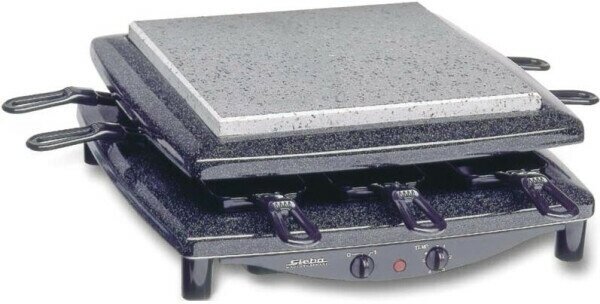 Гриль-раклетница Steba RC 3 plus имеет гриллирующую поверхность из камня и используется для приготовления пищи без лишнего масла и жира. Восемь маленьких сковородочек-противней располагаются в нижней части прибора. Они имеют антипригарное покрытие.