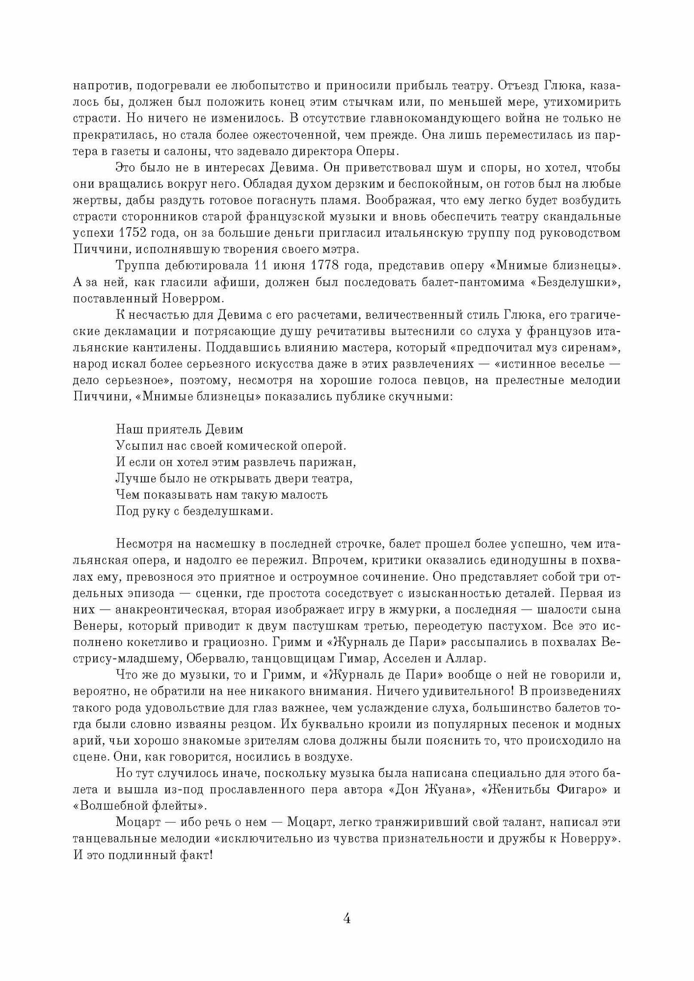 Свой единственный балет В. А. Моцарт сочинил, когда в сентябре 1777 г. останавливался в Париже. С просьбой создать балет к композитору обратился Ж. Ж. Новерр (1727-1810) - танцовщик, хореограф, теоретик и реформатор балета. Премьера в исполнении звездного состава состоялась 11 июня 1778 г. в Париже в Королевской академии музыки. "Безделушки" ("Les petits riens") были показаны при жизни Моцарта лишь несколько раз. На долгое время балет был забыт, однако в начале XX века возродился. Для балетмейстеров это произведение уже не содержит тех новаторских черт, которые были важны для первой постановки - балет стал историей, вызывающей интерес и вдохновляющей на новые прочтения классики. Комический одноактный балет "Безделушки" - это прощание со старым стилем, прошлой стилистикой. Сюжет балета включает в себя три сцены-миниатюры. Сцена первая: пастушки ловят Купидона сетью и заключают в клетку. Сцена вторая: игра в жмурки. Сцена третья: Купидон заставляет двух пастушек ревновать третью, переодетую пастушком, но она раскрывает свой секрет. Заканчивается представление разнообразными фигурами. W. A. Mozart composed his one and only ballet during his stay in Paris in September, 1777. It was J.?G. Noverre (1727-1810), a dancer, choreographer, theorist and ballet reformer, who offered the composer to create a ballet. The all-stars premiere took place on June 11, 1778 in Paris at the Royal Academy of Music. "The Little Nothings" ("Les petits riens") was performed only a few times during Mozart's lifetime. Since then, the ballet was forgotten for a long time, but it was revived at the beginning of the 20th century. This work contains no longer those innovative features for choreographers that were important for the first production, the ballet has become a history that arouses interest and inspires new interpretations of classics. The comic one-act ballet "Les petits riens" represents a farewell to the old style, the stylistics of the past. The ballet plot includes three miniature scenes. Scene 1: the shepherdesses catch Cupid with a net and imprison him in a cage. Scene 2: game of blind man's buff. Scene 3: Cupid makes two shepherdesses jealous of the third one, disguised as a shepherd, but she reveals her secret. The performance ends with diverse figures.