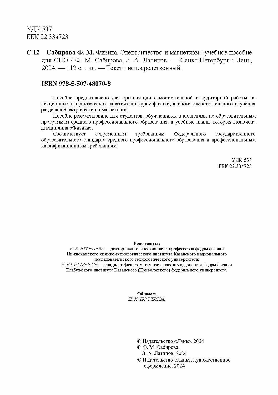 Физика. Электричество и магнетизм. Учебное пособие для СПО (Сабирова Файруза Мусовна, Латипов Загир Азгарович); Лань, 2024