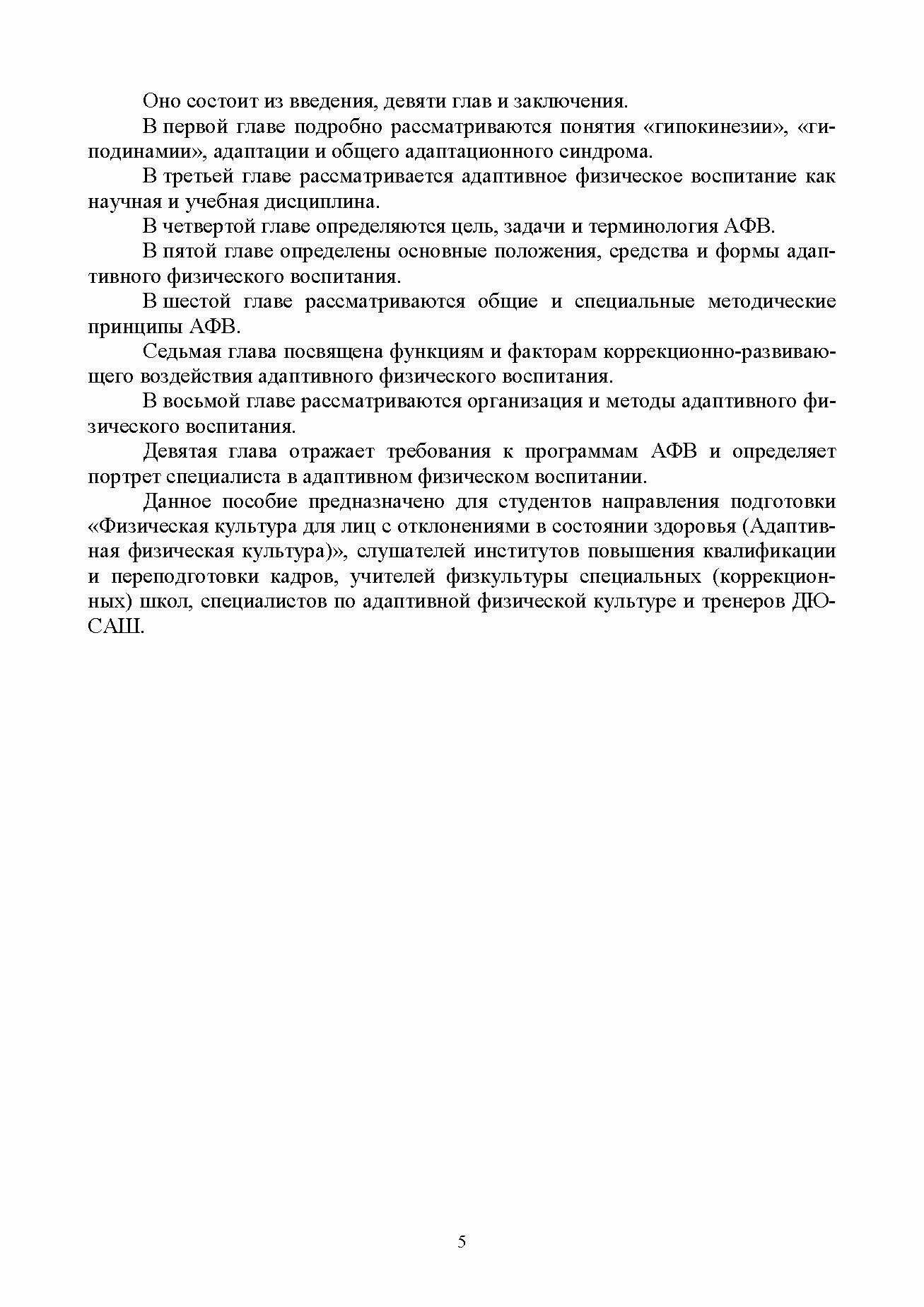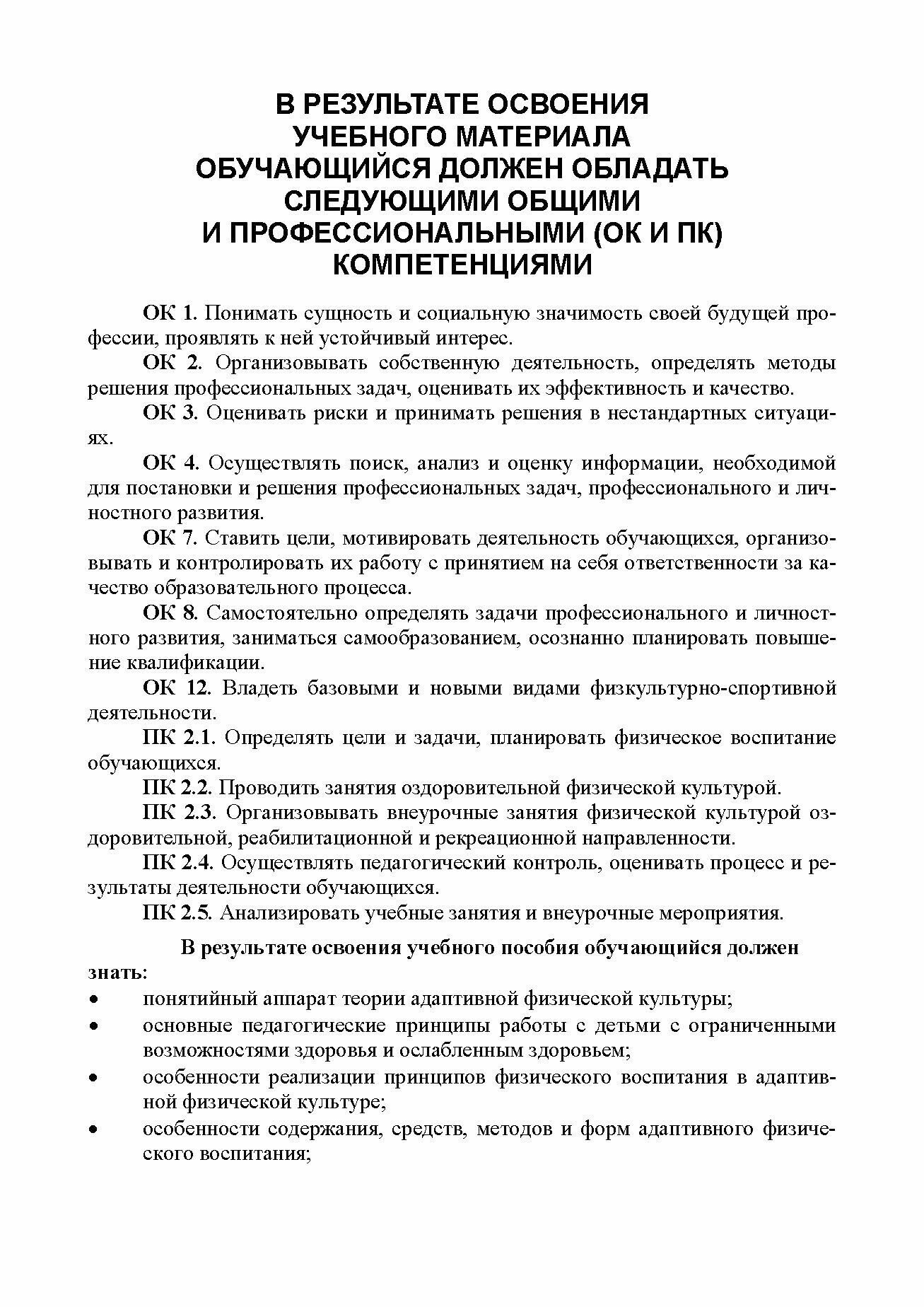 Учебное пособие предназначено для учащихся колледжей, обучающихся по направлению подготовки "Адаптивная физическая культура", слушателей курсов повышения квалификации и переподготовки кадров институтов дополнительного образования, а также для специалистов общеобразовательных и специальных (коррекционных) образовательных учреждений, учреждений системы социальной защиты, занимающихся организацией физкультурно-оздоровительной работой с лицами с отклонениями в состоянии здоровья. Соответствует современным требованиям Федерального государственного образовательного стандарта среднего профессионального образования и профессиональным квалификационным требованиям.