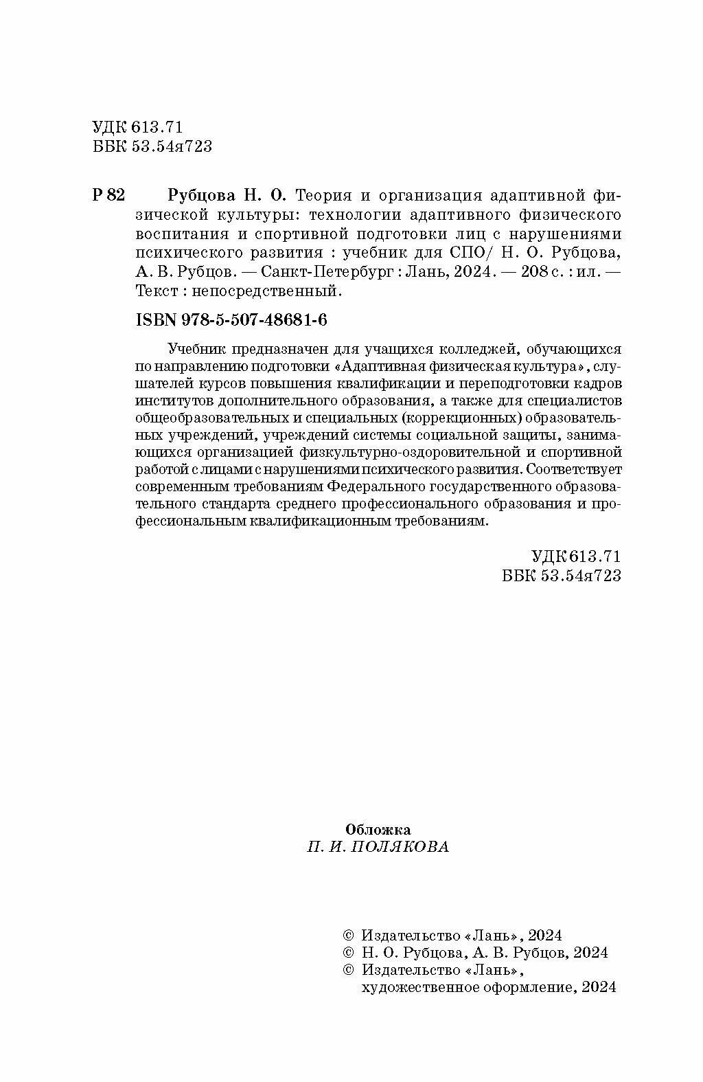 Теория и организация адаптивной физической культуры. Технологии адаптивного физического воспитания (Рубцов Алексей Валерьевич, Рубцова Наталия Олеговна); Лань, 2024