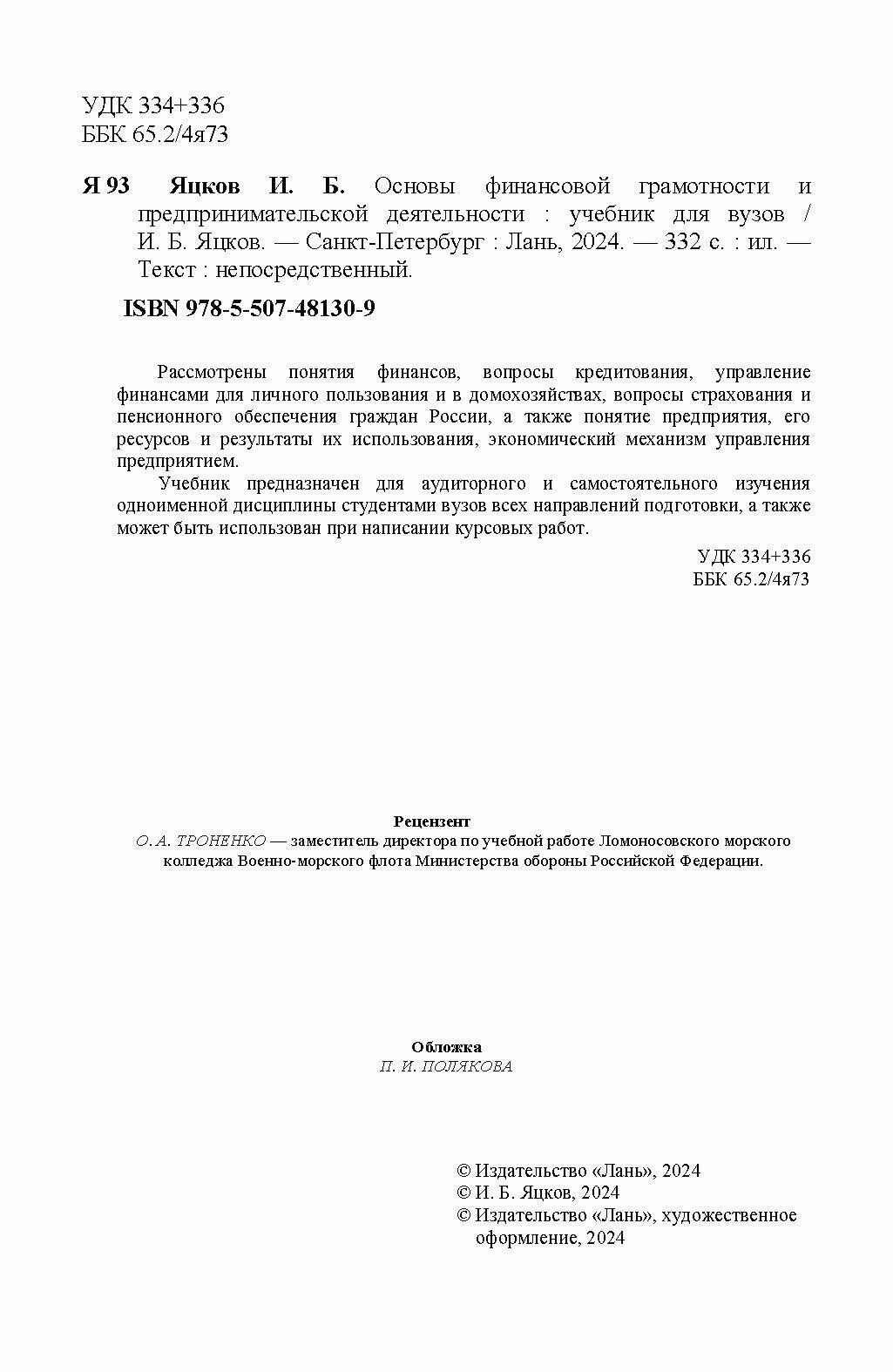 Основы финансовой грамотности и предпринимательской деятельности. Учебник для вузов (Яцков Игорь Борисович); Лань, 2024