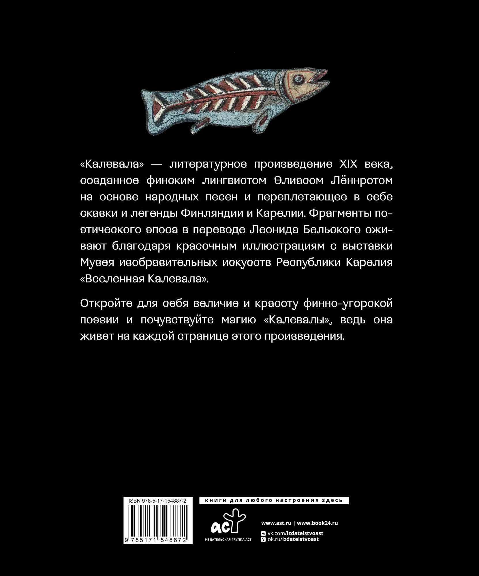 Книга представляет собой фрагменты карело-финского поэтического эпоса "Калевала" в переводе Леонида Бельского, сопровождаемые красочными иллюстрациями с выставки Музея изобразительных искусств Республики Карелия "Вселенная Калевала". Это литературное произведение, созданное в XIX веке финским лингвистом Элисом Леннротом на основе народных песен, помимо увлекательного чтения, позволяет погрузиться в волшебный мир сказок и легенд, изучить культуру и историю Финляндии и Карелии, а также проникнуться величием и красотой финно-угорской поэзии.
