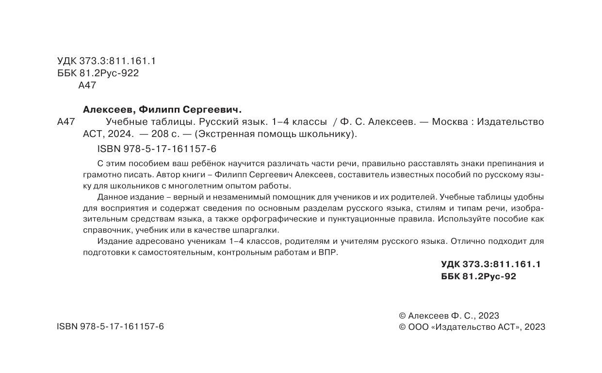 С этим пособием ваш ребенок научится различать части речи, правильно расставлять знаки препинания и грамотно писать. Автор книги - Филипп Сергеевич Алексеев, составитель известных пособий по русскому языку для школьников с многолетним опытом работы. Данное издание - верный и незаменимый помощник для учеников и их родителей. Учебные таблицы удобны для восприятия и содержат сведения по основным разделам русского языка, стилям и типам речи, изобразительным средствам языка, а также орфографические и пунктуационные правила. Используйте пособие как справочник, учебник или в качестве шпаргалки. Издание адресовано ученикам 1-4 классов, родителям и учителям русского языка. Отлично подходит для подготовки к самостоятельным, контрольным работам и ВПР.