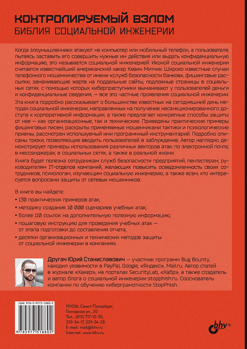 Книга рассматривает используемые современными киберпреступниками методы социальной инженерии и способы защиты от нее — как организационные, так и технические. Приведено 130 практических примеров атак, даны примеры фишинговых писем, раскрыты применяемые мошенниками психологические приемы и трюки, позволяющие вводить пользователей в заблуждение, подробно разобран используемый злоумышленниками программный инструментарий. Описаны различные векторы атак: по электронной почте,в мессенджерах, в социальных сетях и в реальной жизни. Предложена методика создания 10 000 сценариев учебных атак, а также дана пошаговая инструкция их проведения от этапа подготовки до составления отчета.