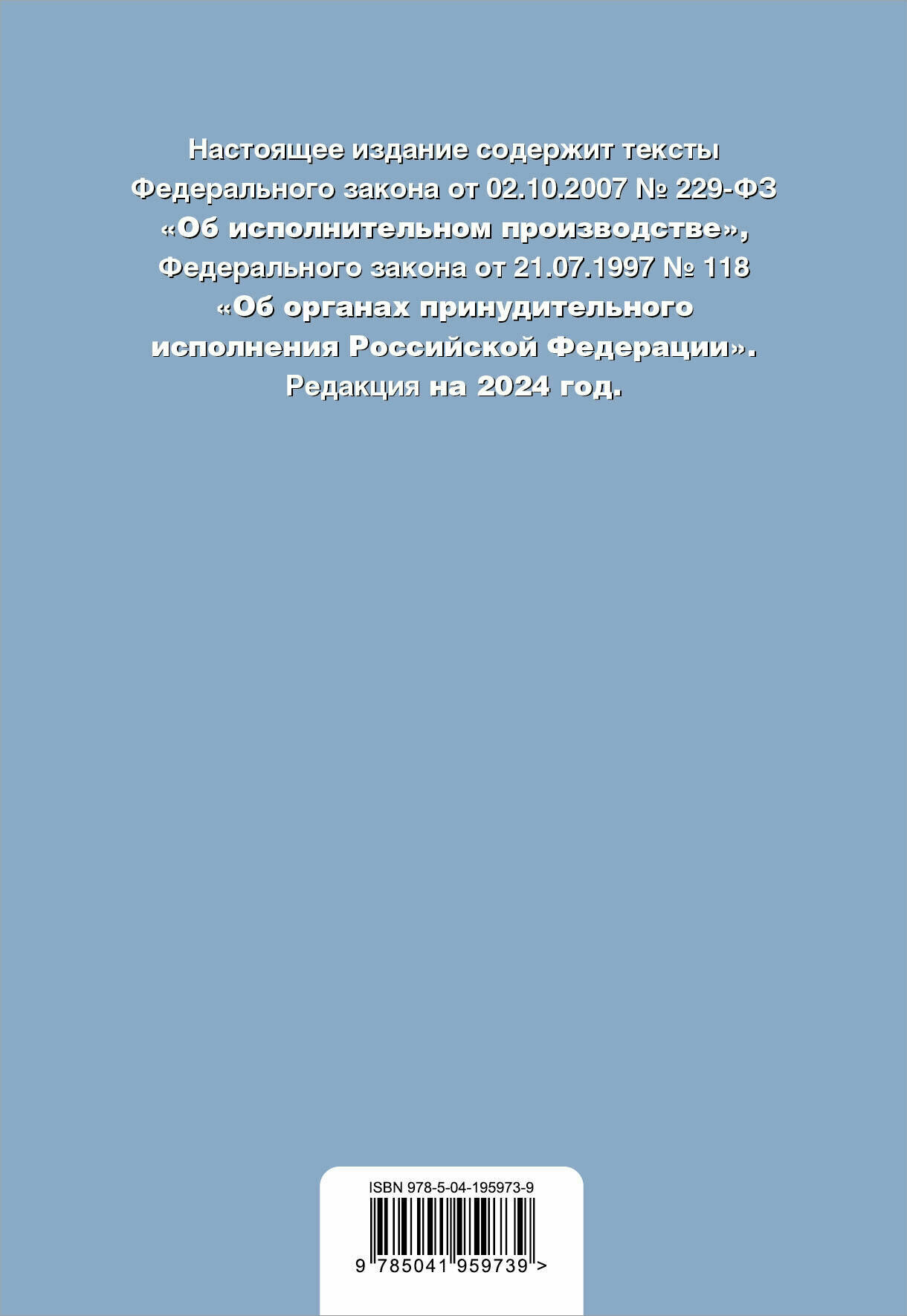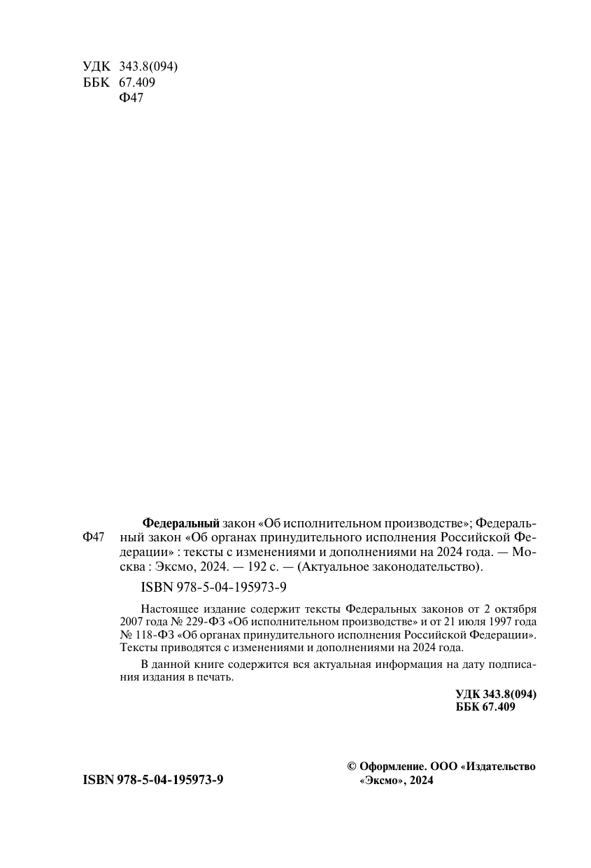 ФЗ "Об исполнительном производстве". ФЗ "Об органах принудительного исполнения Российской Федерации". В ред. на 2024 / ФЗ № 229-ФЗ. ФЗ № 118-ФЗ (без автора); ООО "Издательство "Эксмо", 2024
