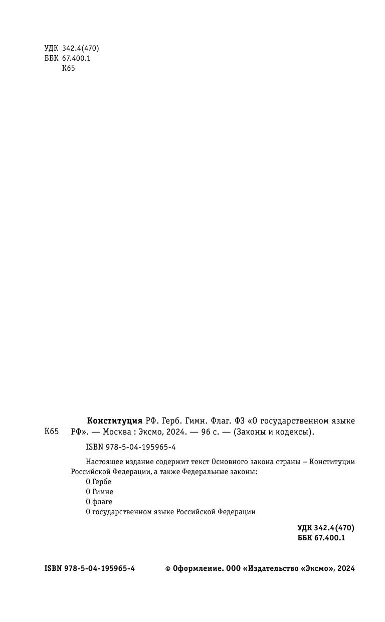 Конституция РФ. Герб. Гимн. Флаг. ФЗ "О государственном языке РФ" (без автора); ООО "Издательство "Эксмо", 2024