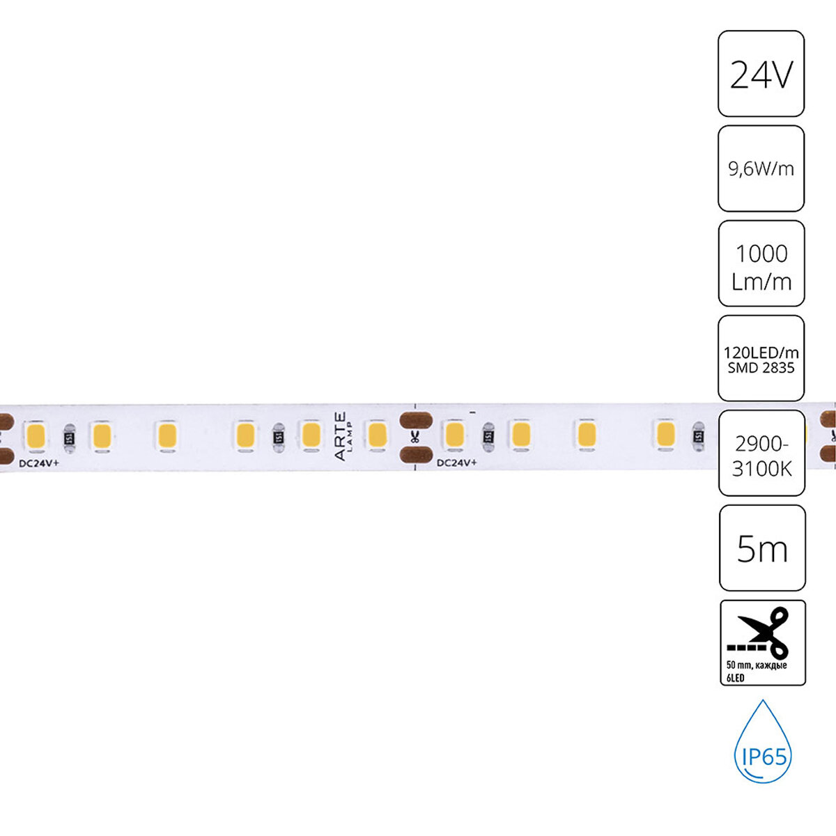 Светодиодная лента 24V 96W/m 3000К 5м Arte Lamp AQUA TAPE A2412008-04-3K / белый