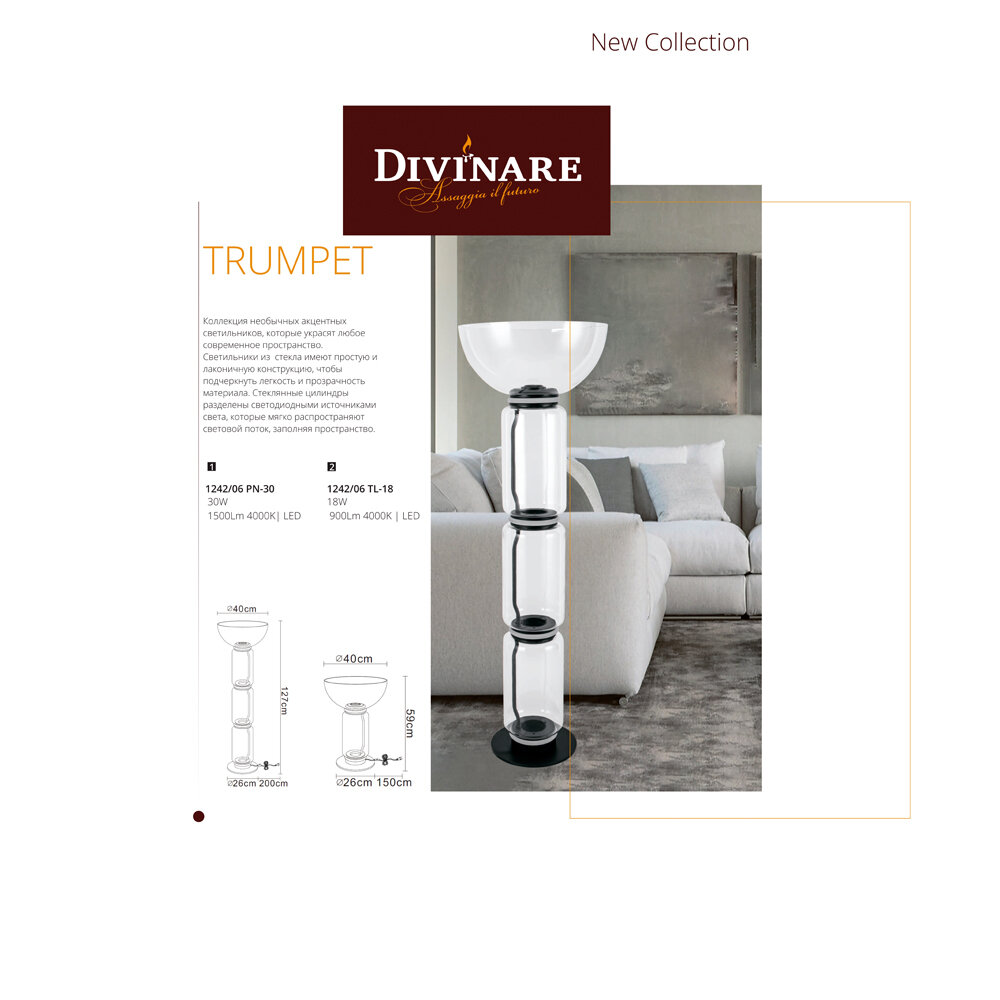 Коллекция TRUMPET и модель 1242/06 TL-18 итальянского производителя Divinare разработана для интерьера гостиной в стиле модерн. Декоративная настольная лампа Divinare TRUMPET весит 8.02 кг и обладает габаритами 59 см по высоте, 40 см диаметром. Арматура черного цвета выполнена из металла, полукруглый прозрачный плафон направленный вверх, произведен из силикона. Перед покупкой рекомендуем внимательно изучить инструкции по сборке.