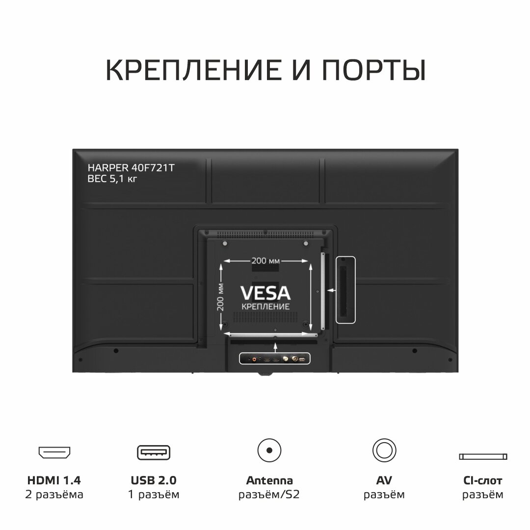 Получите максимум удовольствия от реалистичного изображения и объёмного звучания вместе с нашим новым телевизором – Harper . Диагональ 40 дюймов/101 см. Устройство умеет работать со всеми видами современного телевидения: кабельное, цифровое эфирное (DVB-T/T2) и аналоговое. Поддерживает воспроизведение всех популярных форматов медиафайлов (изображения, видео, аудио). Разрешение экрана – FULL HD (1920x1080 точек).