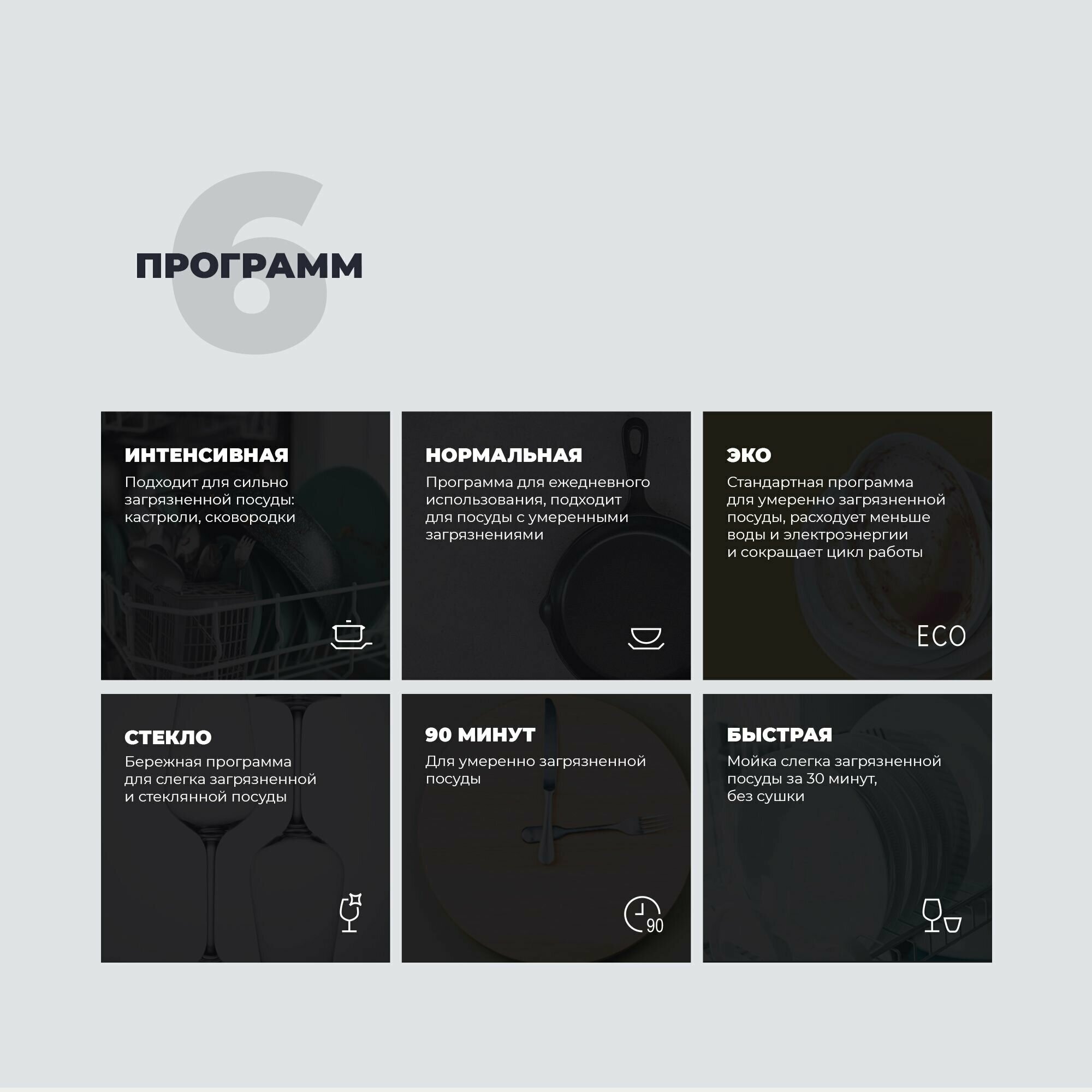 | Программы | обычная программа для повседневного мытья, интенсивная программа для сильнозагрязненной посуды, экспресс-программа (быстрый цикл), деликатная программа для мытья хрупкой посуды, экономичная программа для слабозагрязненной посуды |