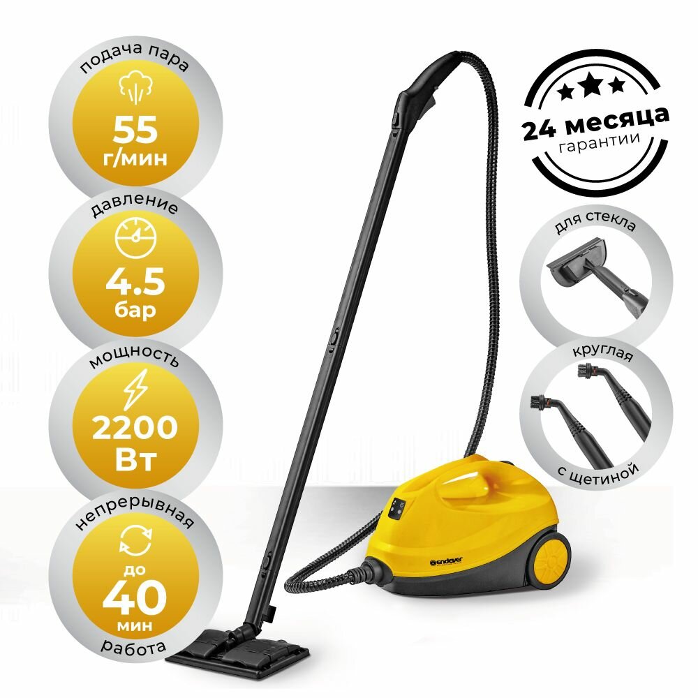 Endever : новое слово в мире уборки и дезинфекции!Современный мир требует современных решений, и мы представляем вам новый уровень в уборке и дезинфекции с Универсальным отпаривателем-пароочистителем Endever . Этот надежный спутник для вашего дома или офиса обеспечивает выдающуюся производительность и надежность, позволяя вам с легкостью справляться с разнообразными задачами.Продуманный дизайн:Стильный темно-серый и желтый дизайн Endever придает прибору современный вид. Его удобная рукоятка и легкий вес делают использование комфортным, а компактные размеры позволяют легко хранить прибор после использования.Мощность и эффективность:С мощностью 1600 Вт и давлением пара 3,5 бар, этот пароочиститель быстро нагревается и готов к работе всего за 5 минут. Емкость бака 700 мл и производительность пара впечатляют - 85 г/мин. Это позволяет проводить уборку без лишних перерывов и прерываний.Безопасность на первом месте:Защита от детей обеспечивает безопасное использование в присутствии маленьких детей. Двойная защита от перегрева и избыточного давления гарантирует долгий срок службы прибора безопасным.Универсальные насадки:Endever поставляется с 6 насадками, которые обеспечивают эффективную очистку и дезинфекцию любой поверхности. Мерный стакан объемом 300 мл в комплекте делает процесс использования более удобным.Дезинфекция без химии:С температурой пара, достигающей до 105 °C, вы можете проводить дезинфекцию поверхностей без использования химических средств. Это экологичное и безопасное решение для вашего дома.Простое управление:Плавная регулировка степени подачи пара позволяет вам настроить прибор по своим потребностям, а индикация готовности пара облегчает мониторинг процесса.Endever - это не просто пароочиститель, это ваш надежный помощник в уборке и дезинфекции, который справится с самыми сложными задачами. Наслаждайтесь чистотой и свежестью вашего пространства с Endever !
