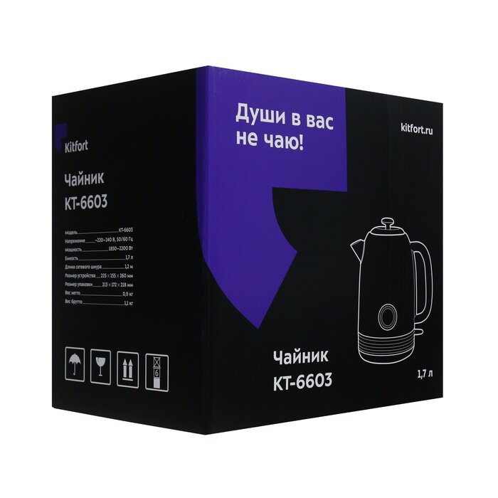 Электрический чайник Kitfort предназначен для кипячения воды дома, в офисах и на дачах. Благодаря форме корпуса и стильному дизайну чайник станет украшением вашей кухни! Чайник оснащён встроенным термометром. Это очень удобно при заваривании напитков, для которых необходимо определённое значение температуры воды, например, зелёный чай, белый чай, кофе и т.д. Крышка чайника полностью съёмная, что облегчает доступ внутрь чайника. Нагревательный элемент (ТЭН) в донной части закрыт пластиной из нержавеющей стали. Это препятствует образованию накипи, облегчает уход и значительно снижает шум при нагревании воды. За один раз в чайнике можно вскипятить до 1,7 л воды. Этого хватит, чтобы приготовить горячие напитки на большую семью! Мерная шкала позволяет легко следить за уровнем воды. В кнопку включения/выключения встроен индикатор нагрева. Специальная форма носика позволяет точно наливать воду в чашку без расплёскивания и брызг и быстро наполнять её. Встроенный фильтр в носике не даст накипи попасть в напиток из чайника. Подставка с центральным контактом даёт возможность располагать на ней чайник в любом положении, обеспечивая вращение на 360°. Широкое горлышко облегчает доступ внутрь чайника при мытье и во время удаления накипи.