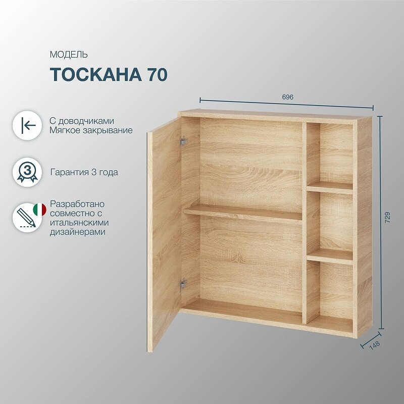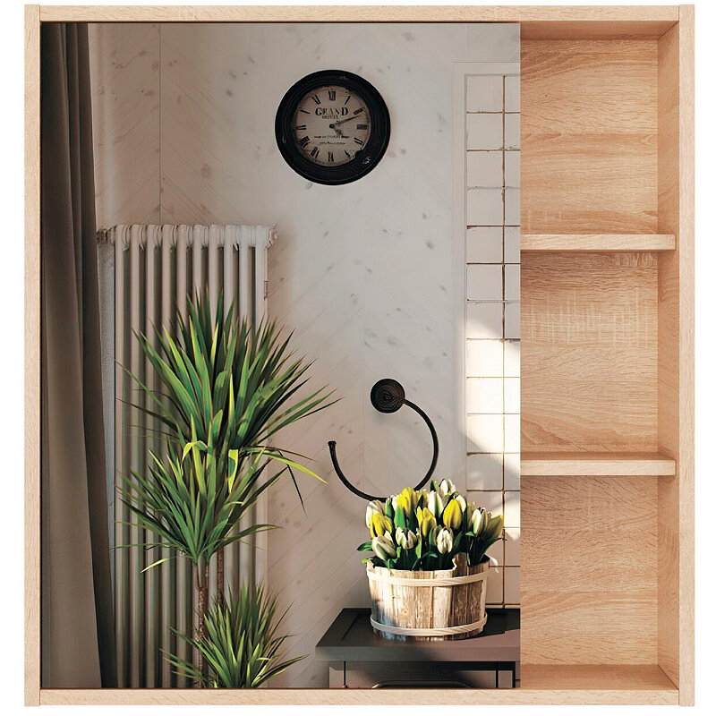 Зеркало-шкаф Sanstar Тоскана 70 дуб сонома светлый великолепно подойдет как для просторной ванной комнаты, так и для небольшого помещения.